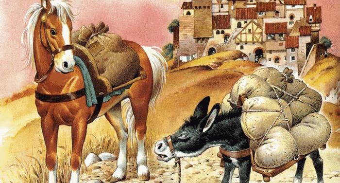 C'era un uomo che aveva un asino e un cavallo. Un giorno che stavano viaggiando per la strada, l'asino disse al cavallo: "Prendi un po' del mio carico se non vuoi vedermi morto". Ma l'altro non volle saperne. L'asino, sfinito dagli stenti, stramazzò e morì. Allora il padrone trasferì sul dorso del cavallo tutto il carico e in più la pelle dell'asino.