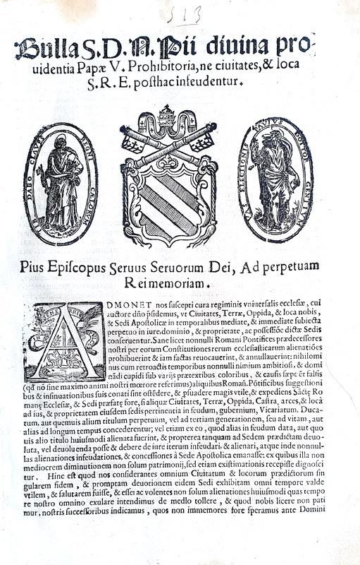 Bulla s.d.n. Pii divina providentia papae V prohibitoria, ne civitates, et loca S.R.E. posthac infeudentur. (Roma,Blado, 1567).