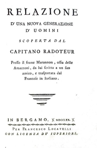 Relazione d'una nuova generazione d'uomini scoperta dal capitano Radoteur presso il fiume Marannon, ossia delle Amazzoni, da lui scritta a un suo amico, e trasportata dal franzese in italiano. In Bergamo, per Francesco Locatelli, 1770
