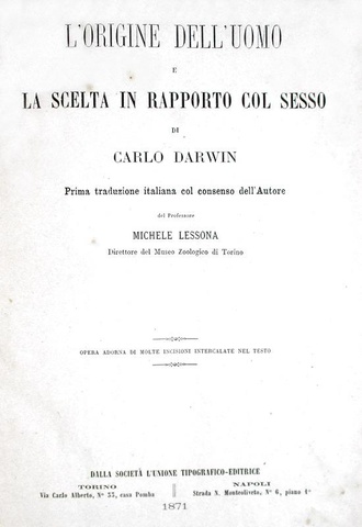 L'origine dell'uomo e la scelta in rapporto col sesso. Prima traduzione italiana col consenso dell'Autore del professore Michele Lessona direttore del Museo Zoologico di Torino. Opera adorna di molte incisioni intercalate nel testo. Torino-Napoli, Ute, 1871