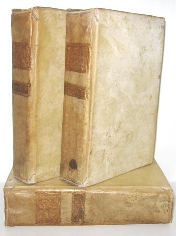 Tre volumi di cm. 17,5, pp.(18) cviii (2), 406 (2); xx, 444 (8); (2) 505 (7). Legatura strettamente coeva in piena pergamena rigida con titoli in oro su doppio tassello al dorso. Fioriture sparse (per...