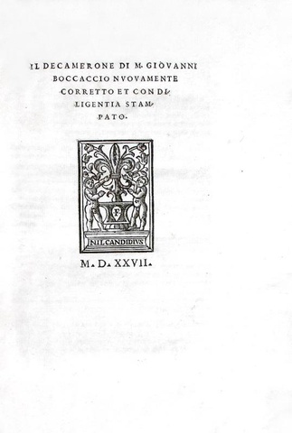 Il Decamerone. Nuovamente corretto et con deligentia stampato. In Fiorenze (recte: Venezia), per li heredi di Philippo di Giunta (recte: Stefano Orlandelli, coi torchi di Pasinello), 1527 (recte: 1729)