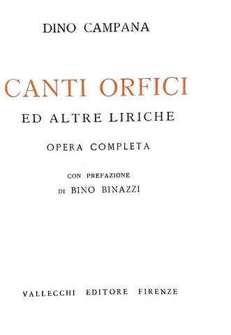 Canti Orfici ed altre Liriche. Opera completa con Prefazione di Bino Binazzi. Firenze, Vallecchi, 1928