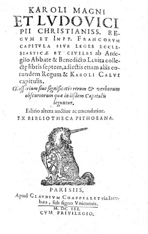 vendutoKaroli Magni et Ludovici Pii Christianiss. Regum et Impp. Francorum Capitula, sive leges ecclesiasticae et civiles. Parisiis, apud Claudium Chappellet, 1603
