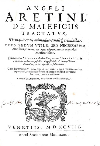 De maleficiis tractatus, de inquirendis animaduertendisque criminibus. Opus ... cui tractatus Alberti de Gandino, nec non Bonifacii de Vitalinis, una cum apostillis Augustini de Arimino, et Hier. Cuchalon... Cum eiusdem Angeli vita, per Thomam Diplobatacium edita. Venetiis, apud Societatem Minimam, 1598
