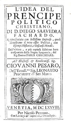 vendutoIdea del principe politico christiano ... Rappresentata con bellissime imprese, quali dimostrano il vero esser politico, con esempi historici, e discorsi morali. Dall'ultima, e più copiosa editione hora trasportata dalla lingua spagnuola, dal Sig. Dottor Paris Cerchiari. Venetia, per Nicolò Pezzana, 1678