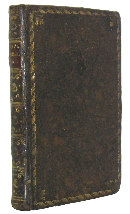 Cm. 11,5, pp. 166 + (2) di index. Titolo traslietterato dal greco; testo in greco e latino. Con marchio tipografico Plantin al frontespizio e numerose iniziali xilografiche. Graziosa legatura antica (sei/settecentesca) in piena pelle con titoli su tassello e fregi in oro al dorso; piatti inquadrati da cornice dorata e tagli rossi. Traccia di antica firma di possesso al frontespizio. Trascurabili segni del tempo alla legatura e sporadiche/lievi fioriture, leggera traccia di polvere sedimentata al frontespizio. Esemplare nel complesso genuino e ben conservato. Rara e pregevole edizione tascabile plantinana delle favole di Esopo pubblicate su doppia colonna con il testo greco affiancato alla traduzione latina. Cfr. Iccu, che censisce pochissimi esemplari conservati nelle biblioteche pubbliche italiane.