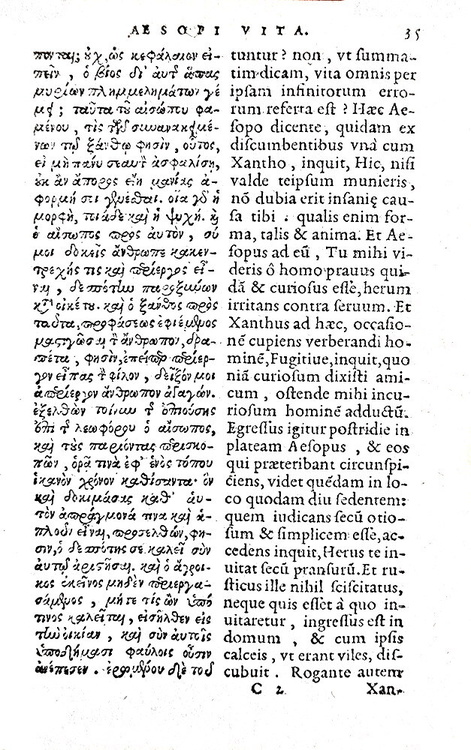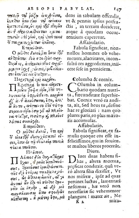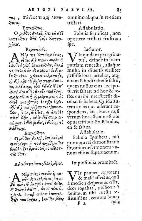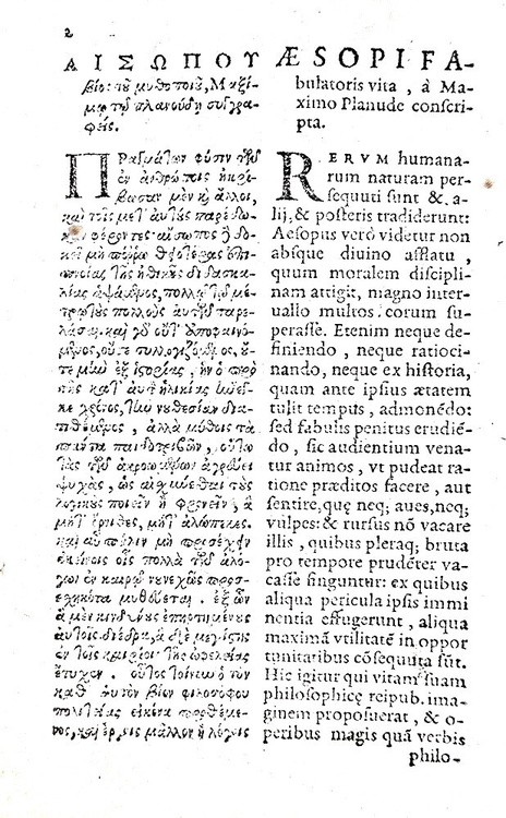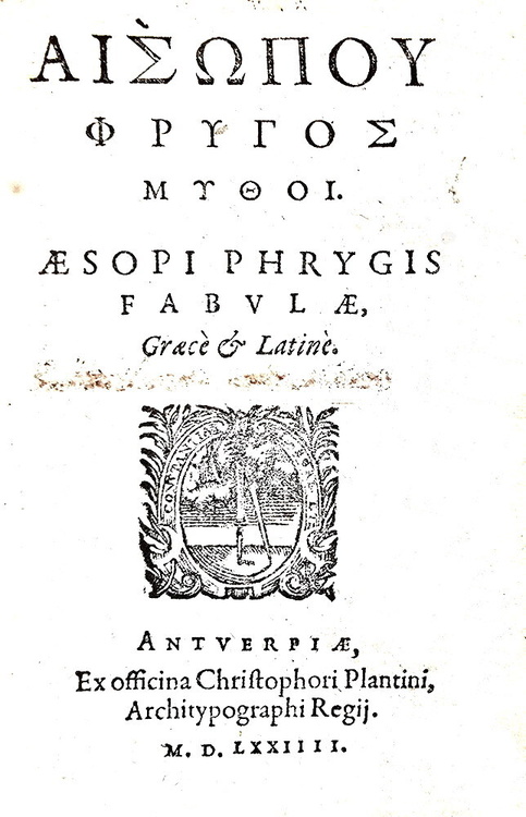 Aisopou Phrygos Mythoi. Aesopi Phrygis fabulae graece & latine. Antuerpiae, ex officina Christophori Plantini, architypographi regij, 1574.