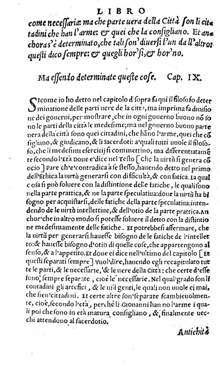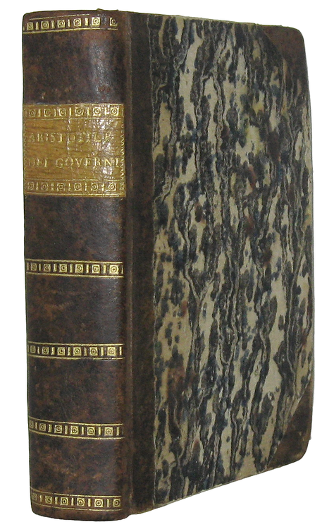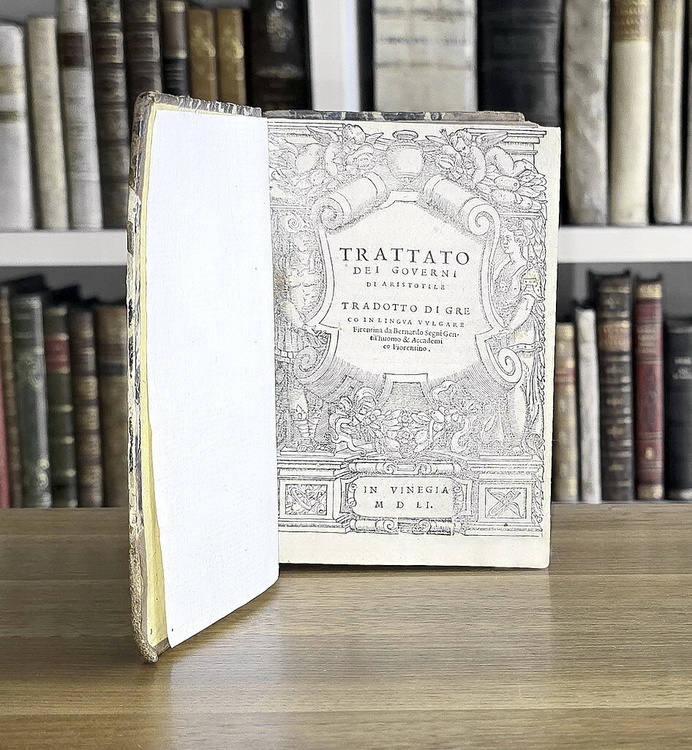Cm. 15, cc. 230 (17) [l'ultima carta è bianca]. Bellissimo frontespizio illustrato con dati tipografici entro cornice xilografica; eleganti capilettera, finalini e testatine. Legatura settecentesca in mezza pelle con punte; titoli su tassello in pelle e fregi in oro al dorso. Carta decorata ai piatti e tagli spruzzati. Trascurabili segni del tempo. Esemplare nel complesso fresco e ben conservato. Importantissima traduzione della Politica di Aristotele compilata da Bernardo Segni e pubblicata dai tipografi Bartolomeo “detto l'Imperador” e dal genero Francesco. È un testo chiave del Rinascimento politico fiorentino e un tassello fondamentale della diffusione aristotelica in volgare. Bernardo Segni (Firenze, 21 febbraio 1504 – 13 aprile 1558), membro dell'Accademia Fiorentina, aveva completato la traduzione nel 1548. La traduzione segue fedelmente la struttura aristotelica in libri e capitoli, accompagnata da brevi rubriche che guidano il lettore attraverso i temi fondamentali del pensiero politico antico, tra cui le forme di governo, la cittadinanza, l'educazione, l'equilibrio costituzionale. L'edizione del 1551 rappresenta una delle prime stampe veneziane in volgare della teoria politica aristotelica, pensata per un pubblico colto ma non universitario, e testimonia la vivace circolazione veneziana dei testi umanistici. Le opere di Aristotele, poco note sino ai tempi di Pompeo, furono poi pubblicate e ordinate da mani poco abili, e che non solo i libri della Politica ma anche altre opere dello Stagirita presentano segni evidenti di disordine. Nel Trattato dei governi appunto il soggetto, interrotto al terzo libro, ricomincia e continuia nel settimo e nell'ottavo, e l'argomento, imperfettamente trattato nel quarto,è poi da Aristotele compiuto nel sesto. L'ordine reale, è invece il seguente: primo, secondo, terzo, settimo, ottavo, quarto, sesto e quinto libro. Nel terzo libro Aristotele afferma esservi tre forme fondamentali di governi: monarchia, aristocrazia, repubblica. Nel settimo e nell'ottavo egli tratta dell'aristocrazia, che, al suo giudizio, è tutt'una cosa con la costituzione esemplare, con l'ottimo governo. Nei libri quarto e sesto tratta della repubblica e delle forme degeneri dei tre governi puri: la tirannide, l'oligarchia e la demagogia; e, poichè i governi oligarchici e democratici sono i più comuni, ne ragiona più a lungo e ne dà i principî speciali. Viene da ultimo il quinto libro, dopo aver considerato tutti i governi, nella loro natura, nelle loro condizioni particolari, Aristotele ne studia la durata e fa vedere in che maniera ciascuno di essi può conservarsi o risica di perire. Seconda edizione piuttosto rara e ricercata (editio princeps: Firenze, Torrentino 1549). Cfr. Iccu; Gamba, 91; Argelati, I, 99; Graesse, I, 218.
