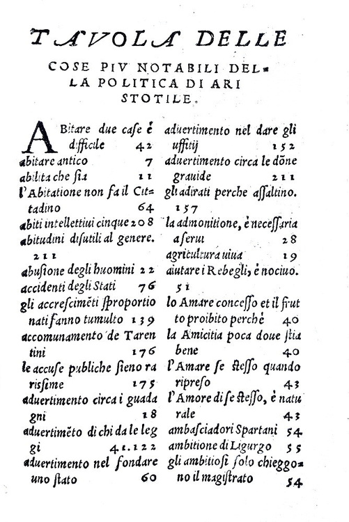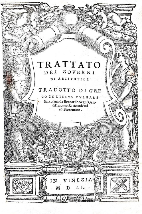 Trattato dei governi di Aristotele tradotto di greco in lingua volgare fi(o)rentina da bernardo segni gentil'huomo & accademico fiorentino. In Vinegia, per Bartolomeo detto l'Imperador & Francesco suo genero, 1551.