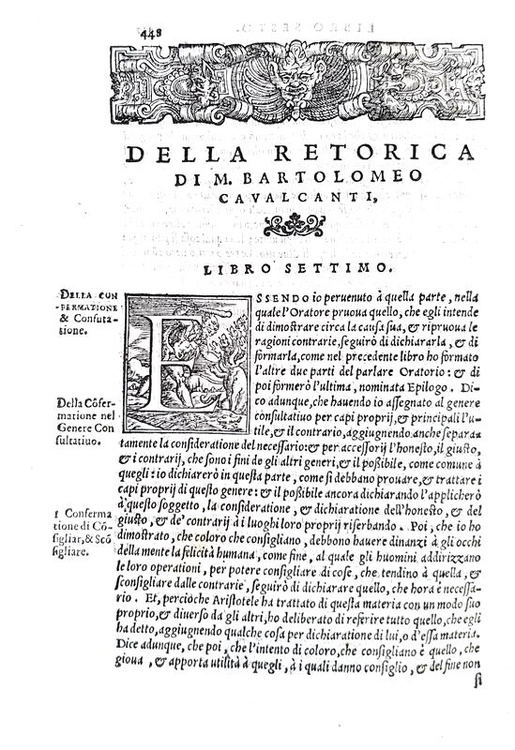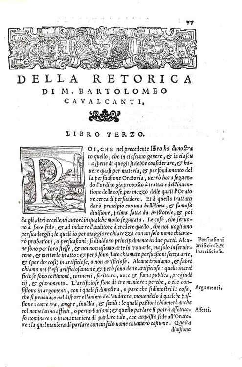Cm. 22, pp. (12) 563 (1). Con una bel marchio tipografico al frontespizio, numerosi capilettera istoriati, finalini e belle testatine xilografiche. Carta bianca finale assente. Bella legatura antica (sei-settecentesca) in piena pergamena rigida con titoli su tassello in marocchino rosso e tagli colorati. Insignificante forellino al margine interno bianco del frontespizio. Sporadiche e lievi fioriture; trascurabili e piccoli aloni limitati al margine esterno di poche carte. Esemplare nel complesso fresco e ben conservato. Bartolomeo Cavalcanti (1503-1562), letterato e uomo politico fiorentino, fu al centro della vita culturale e politica del tempo. «Frequentò, tra gli altri, Antonio degli Alberti, Pier Vettori, Nicolò Ardinghelli, Giovanni Della Casa, Luigi Alamanni e Niccolò Machiavelli, “i ragionamenti del quale – si legge nella prima lettera superstite del Cavalcanti –, come suavissimi e prudentissiani, ogni giorno più desidero né posso fare che d'esserne privato non mi doglia”. [...] Della Retorica, l'opera più rilevante dell'intellettuale fiorentino se non altro per il lungo periodo della sua elaborazione, esiste, in una lettera al Vettori del 1545, un abbozzo relativo agli originari quattro libri, ma tenuto inalterato, nonostante le aggiunte su argomenti parziali, fino all'edizione del '59. Quel che maggiormente interessava lo scrittore è contenuto in alcune annotazioni relative al secondo libro, ove il C. asserisce: “...per sviluppar bene la parte degli argomenti, tratto separatamente della forma loro e qui, per le ragioni che vedrete, fo una logichina quanto a quella parte ...Di poi tratto dei luoghi degli argomenti, movendo prima una questione, se i luoghi dialettici e retorici sono i medesimi o no, importante a mio giudizio”. Il problema dell'identificazione fra dialettica e retorica era stato un tema fortemente dibattuto dalla filologia del secolo precedente, fino a trovare nell'ultimo Poliziano una soluzione in sede estetica. Ora, mentre il C. si mantiene lontano da ogni considerazione sulla poesia [...], mutua poi dalla letteratura quella sintesi che dovrebbe essere appannaggio dell'oratore, dell'esperto nei pubblici negozi e che viene pertanto a configurarsi come una capacità civile, praticabile e suscettibile di un insegnamento.» (cfr. la voce C. cirata da Claudio Mutini in Dizionario Biografico degli Italiani, volume 22). La Retorica in definitiva è considerato il primo trattato sul tema scritto in volgare italiano. Rara terza edizione uscita nel medesimo anno delle prime due stampate da Giolito a Venezia. Cfr. Iccu.; Gamba, 1307: “edizione molto stimata”.