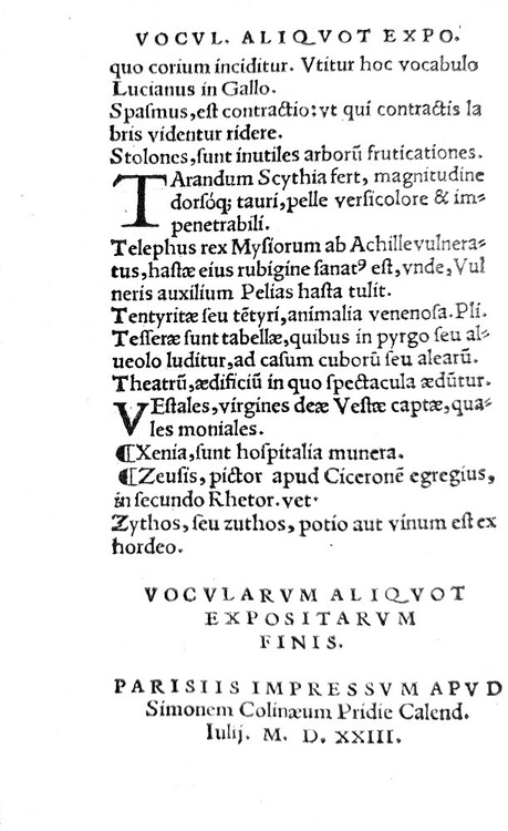 Parabolae sive Similia D. Erasmi Roterdami postremum ab autore recognita cum accessione nonnula, adiectis aliquot vocularum obscurarum interpretationibus. Parisiis, apud Simonem Colinaeum, 1523.