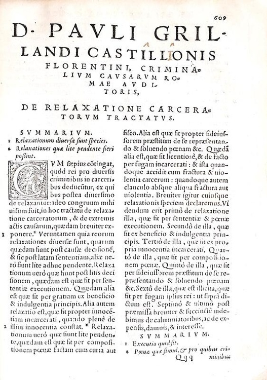 Cm. 16,5, pp. 702. Bella legatura del tempo in piena pergamena rigida; dorso a 3 grossi nervi con titoli manoscritto. Antica firma di possesso al frontespizio e alcune annotazioni marginali di mano coeva. Lieve e perlopiù marginale alone nella prima parte del libro e al margine esterno delle ultime carte. Sporadiche e trascurabili macchiette. Esemplare nel complesso genuino e in buono stato di conservazione, privo di segni di tarlo. Rarissima e molto ricercata edizione giuntina lionese che raccoglie alcuni dei trattati di diritto criminale più significativi scritti dal tardo Medioevo al Cinquecento: Tractatus De Maleficiis (pp. 3-305) di Alberto da Gandino (1240 ca. - 1310 ca.) celebre criminalista cremasco che ricoprì gli incarichi di assessore, giudice e podestà in diverse città italiane; Tractatus de Maleficiis (pp. 306-608) di Bonifacio Vitalini (1320 ca. - 1390 ca.) criminalista mantovano; De quaestionibus & tormentis tractatus (pp. 686-696) del girista perugino Baldo Perigli (? -1494 ca.); Tractatus De quaestionibus (pp. 697-702) del grande giurista parmense Iacopo d'Arena (1220 ca. - 1290 ca.) e il Tractatus de relaxatione carceratorum (pp. 609-685) di Paolo Grillando Castiglioni (giureconsulto abruzzese attivo nella prima metà XVI secolo), la più importante opera dell'epoca sul carcere e i carcerati. Cfr. Iccu; non in Sapori.