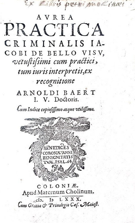 Aurea practica criminalis ex recognitione Arnoldi Baert. Coloniae, apud Maternum Cholinum, 1580.