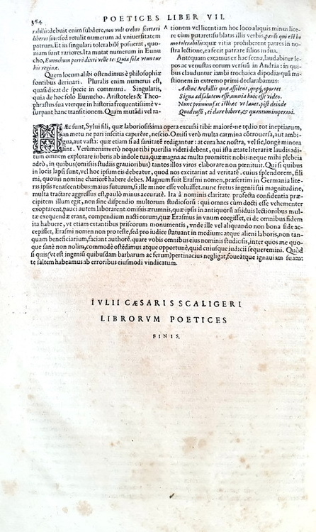 Cm. 30,5, pp. (12) 364 (36) [errori nella numerazione delle pagine e nella fascicolazione del quaderno iniziale, ma esemplare collazionato e completo]. Marchio tipografico al frontespizio, alcuni graziosi capilettera e belle testatine xil. Legatura antica in piena perg. rigida con titoli in oro su tass. al dorso. Carte di guardia assenti. Prime carte leggermente frastagliate nel margine bianco superiore, antiche note ms. di possesso e glosse al margine, lievi e sporadici aloni, fioriture e macchiette sparse. Esemplare nel complesso genuino e in buono stato di conservazione. Giulio Cesare Scaligero (1484-1558), medico e letterato nativo di Riva del Garda, fu una figura di primissimo piano nel panorama culturale europeo della prima metà del XVI secolo. Dopo l’esordio dottrinale avvenuto nel 1531 con un scritto diretto contro il Ciceronianus di Erasmo, Scaligero scrisse di grammatica e di botanica, ottenendo fama e reputazione negli ambienti scientifici. Questo trattato, assai influente nella storia della critica letteraria, teorizzava tra l’altro la superiorità di Virgilio rispetto ad Omero e condizionò anche Shakespeare e Pierre Corneille. Verosimilmente prima edizione (esistono 3 varianti dell’edizione originale con la medesima numerazione della pagine: rispettivamente di Jean Crispin, Antoine Vincent e la terza senza dati tipografici). Cfr. Kvk; Iccu.