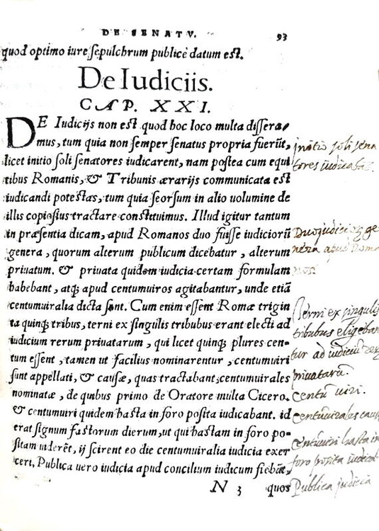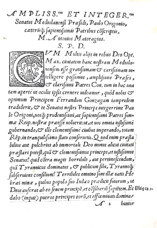 Cm. 20, pp. (8) 103 (1). Bellissima marca tipografica a frontespizio e in fine; graziosi capilettera xilografici; testo in elegante carattere corsivo. Legatura strettamente coeva in piena pergamena floscia con titoli manoscritti al dorso e al taglio superiore. Esemplare con interessantissime e nitide postille cinquecentesche scritte con accurata grafia. Abili restauri conservativi alla legatura, integrazioni professionali alla parte bianca dell'angolo inferiore esterno delle ultime tre carte, macchietta all'angolo inferiore esterno. Esemplare nel complesso genuino e ben conservato. Rara prima edizione postuma di quest'opera storico-politica dedicata alle funzioni del Senato nell'antica Roma e aspramente polemica nei confronti del contemporaneo Senato milanese. L'Autore (1514 a Mairago, da cui il nome latinizzato - 1555) si chiamava in effetti Antonio Maria Conti. Fu professore di Eloquenza nell'Università milanese, letterato e filosofo, personaggio di spicco nella vita cultura di Milano della prima metà del Cinquecento. Ne danno ampie notizie Argelati e Tiraboschi che ricordano la vita avventurosa e le polemiche filosofiche e politiche delle quali fu protagonista. Cfr. Iccu; Adams M-265; non in Cat. Hoepli e Meneghina.