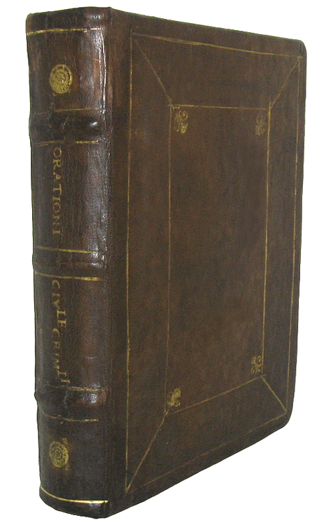 Cm. 22,5, pp. (16) 483 (1). Bel marchio tipografico al frontespizio (ripetuto in piccolo all'ultima carta), numerose testatine, finalini e capilettera xilografici. Bellissima legatura coeva in pieno marocchino color granata; dorso a 3 nervi con titoli e filetti in oro, piatti inquadrati da filetti con 4 fregi dorati floreali. Abile intervento professionale di consolidamento di cuffie e cerniere, sguardie rinnovate in carta antica, minimi restauri conservativi al margine bianco delle ultime tre carte. Arrossature sparse e lievi aloni limitati al margine esterno bianco della seconda parte del volume. Esemplare nel complesso fresco e ben conservato, stampato su carta pesante distinta. Remigio Nannini (1521-1581), fiorentino di nascita fu frate domenicano di Santa Maria Novella, ma visse quasi sempre a Venezia; figura culturalmente eclettica, fu poeta, traduttore, scrittore politico, editore e abile oratore. Quest'interessante raccolta di testi di storia giuridico-politica include tra gli altri i seguenti autori: Dione, Senofonte, Dionigi di Alicarnasso, Quinto Curtio, Appiano Alessandrino, Tito Livio, Sallustio, Egesippo, Procopio di Cesarea, Saffon Grammatico, Leonardo Bruni Aretino, Poggio Bracciolini, Paolo Emilio da Verona, Corio Bernardino, Agostino Giustiniano, Capella Galeazzo e Paolo Giovio. Curiosa l'omissione dal frontespizio del nome di Machiavelli (profusamente menzionato), i cui brani dalle "Istorie Fiorentine" non sono preliminarmente indicati a causa del sospetto che già al tempo avvolgeva le opere del grande scrittore politico fiorentino. Rara prima edizione. Cfr. Iccu; Bongi, Annali di Gabriel Giolito de' Ferrari, II, pp.125-126; Adams, O-242; Gamba, 1545.