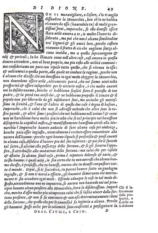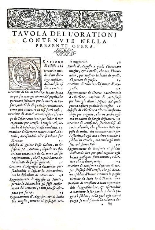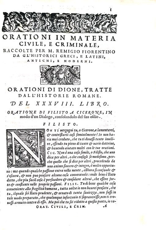 Orationi in materia civile, e criminale, tratte da gli historici greci, e latini, antichi e moderni, raccolte, e tradotte per m. Remigio fiorentino, con gli argomenti a ciascuna oratione, per maggiore intelligenza di quanto si contiene in esse, e con gli effetti che seguirono da dette orationi. Nelle quali, oltre alla cognitione dell'historie, s'ha notitia di governi e di stati, e di republiche, d'accusare, e difender rei, e di molte altre cose utili a ciascuno, ch'attende alla vita civile. In Vinegia, appresso Gabriel Giolito de' Ferrari, 1562.