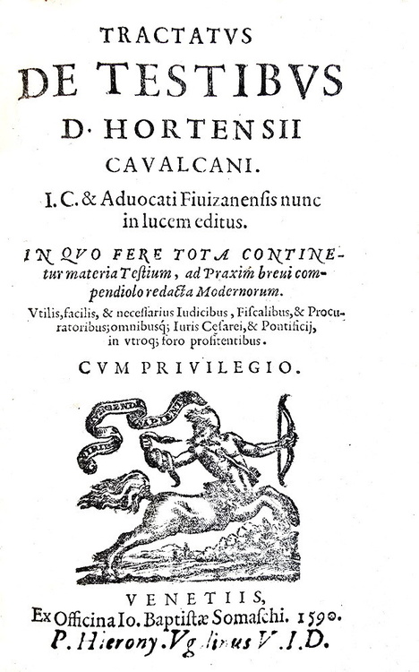 Tractatus de testibus D. Hortensii Cavalcani. I.C. & advocati Fivizanensis nunc in lucem editus. In quo fere tota continetur materia testium, ad praxim brevi compendiolo redacta modernorum. Utilis, facilis, & necessarius iudicibus, fiscalibus, & procuratoribu. Venetiis, ex officina Io. Baptistae Somaschi, 1590.