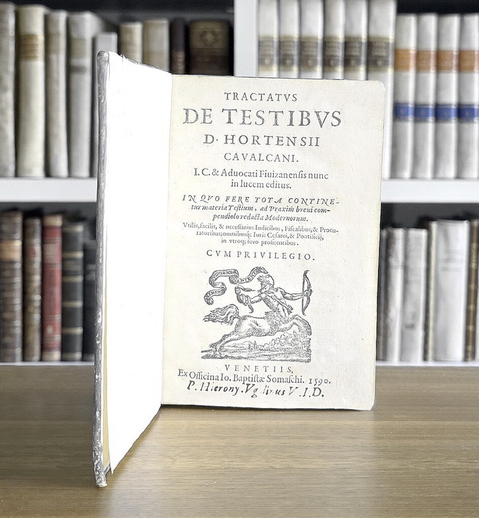 Cm. 15,5 cc. (48) 167 + 1 carta bianca. Bel marchio tipografico al frontespizio e graziosi capilettera xilografici. Solida legatura ottocentesca in cartonato rigido ricoperto da carta policroma maculata; titoli su tassello in pelle nera al dorso. Alcune annotazioni di mano coeva. Antica firma di possesso alla base del frontespizio. Trascurabili/sporadiche fioriture. Esemplare nel complesso fresco e ottimamente conservato. Ortensio Cavalcani (1558-1623), avvocato nativo di Fivizzano, si dedicò prevalentemente al diritto criminale e alla teoria della funzione giurisdizionale. Fu tra i protagonisti, insieme al fratello (1533-1608), della cultura giuridica cinquecentesca toscana. Rara prima edizione di questo significativo trattato, più volte ristampato agli inizi del Seicento, dedicato monograficamente alla prova per testimoni (o testimoniale) nei processi. Cfr. Iccu; Sapori, Antichi testi giuridici, nr. 596; non in Adams.