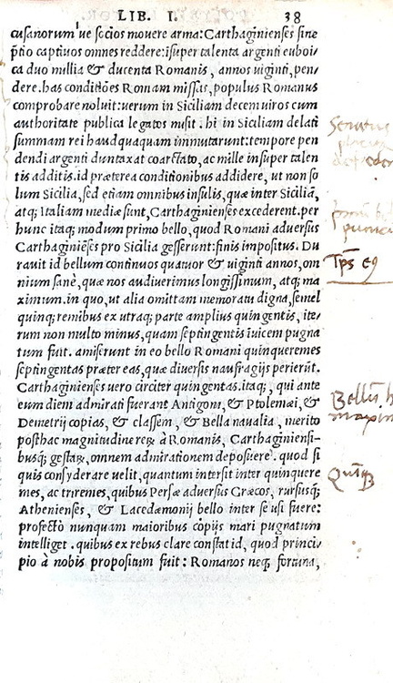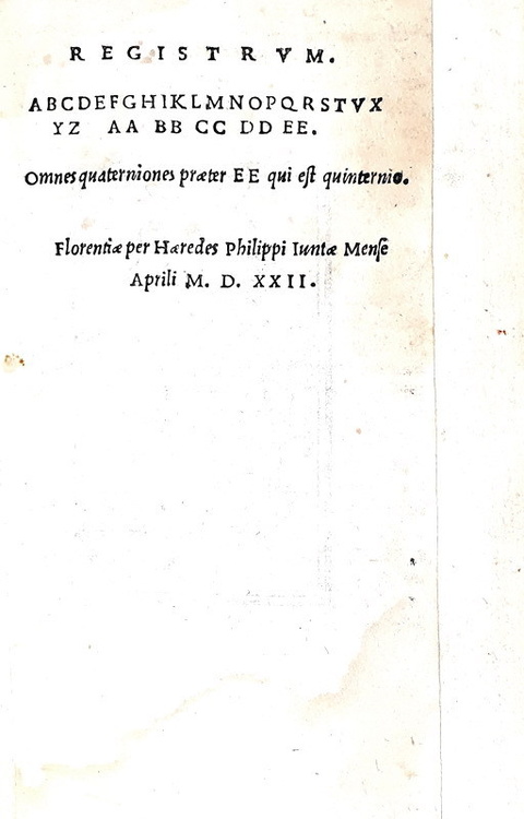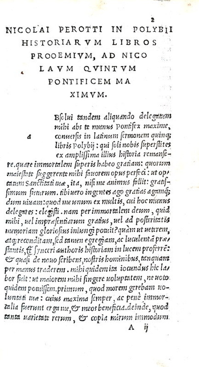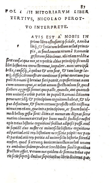 Cm. 16, cc. 225 (1). Bel marchio tipografico giuntino a frontespizio e colophon. Legatura ottocentesca in mezza pergamena con ampie punte e titoli in oro su tass. rosso al dorso. Alcune annotazioni marginali di mano coeva. Trascurabile alone alla parte bassa delle ultime carte, antico rinforzo al margine esterno dell'ultima carta, sporadiche macchiette. Buon esemplare. Delle Storie di Polibio (206 a.C. – 124 a.C.), forse il culmine della storiografia antica per rigore nell'indagine delle fonti, ci sono pervenuti solo i primi cinque libri, oltre a estratti bizantini di altri libri. Polibio tratteggia un grande affresco delle guerre puniche tra Roma e Cartagine; i libri pervenuti coprono gli eventi fino al 216 a.C. Il traduttore Niccolò Perotto (1429-1480), umanista nativo di Fano, si formò a Mantova e a Ferrara con Vittorino da Feltre e Guarino da Verona. Cfr. Iccu; Camerini, 164; Graesse, V, 395; non Adams.