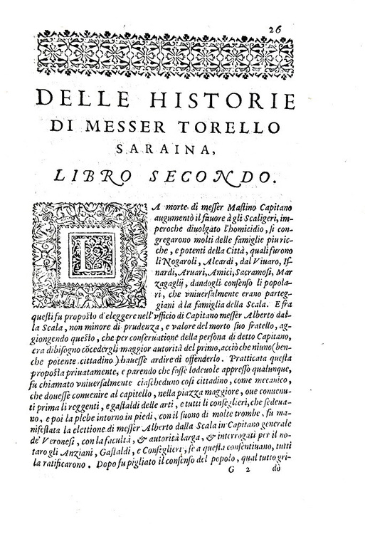 Le historie e fatti de' veronesi ne i tempi del popolo e signori Scaligeri tradotte da Orlando Pescetti. In Verona, appresso Gieronimo Discepoli, 1586.