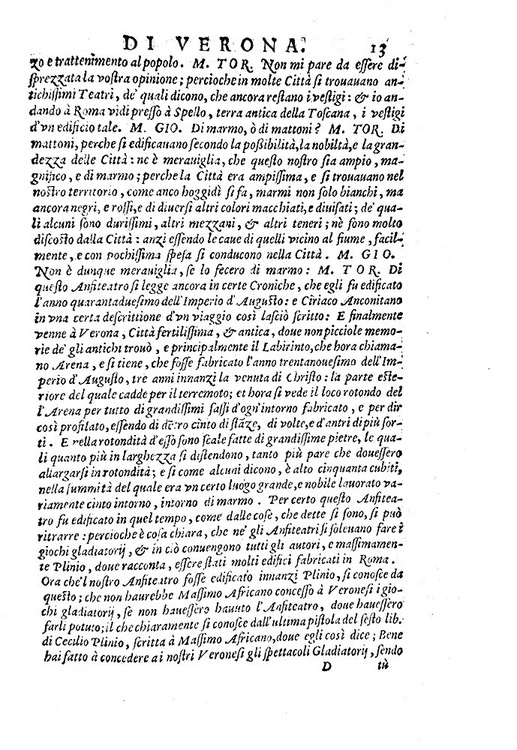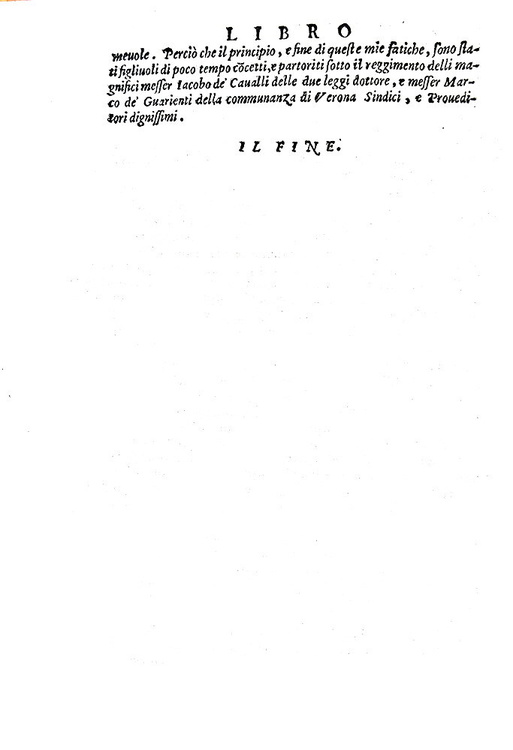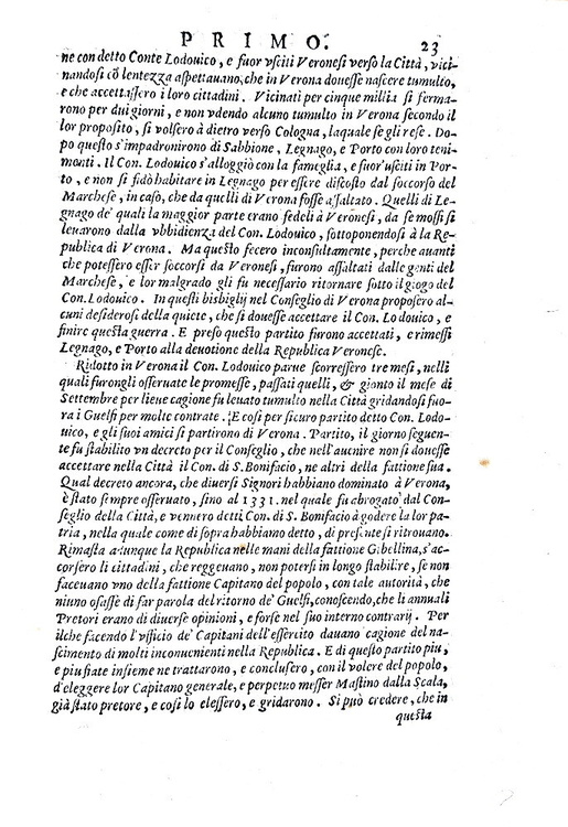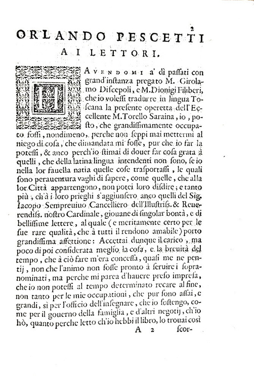 Cc. (4) 70. Unito a: SARAINA TORELLO. Dell'origine et ampiezza della città di Verona tradotta da Orlando Pescetti. Stessi dati tipografici. Pp. 24. Due opere rilegate in un volume di cm. 20,5. Marchio tipografico al frontespizio, bei capilettera, testatine e finalini xilografici; testo in elegante carattere corsivo. Legatura coeva in piena pergamena molle un po' lisa con minime mende al dorso e qualche macchietta al piatto posteriore. Due trascurabili buchetti al margine bianco del frontespizio, lieve alone e qualche macchietta. Esemplare nel complesso genuino, marginoso e in buono stato di conservazione. Torello Saraina (1475-1550), notaio e giureconsulto veronese, fu uno dei primi e più autorevoli storici della città di Verona. Il traduttore Orlando Pescetti (1556-1624), letterato nativo di Marradi (Firenze), svolse la professione di insegnante di grammatica a Verona in una singolare scuola sovvenzionata dal comune e di orientamento vivamente anticonfessionale. Queste due opere uscirono a stampa rispettivamente nel 1542 e nel 1540. Seconda edizione di entrambe le opere; prima edizione in lingua italiana limitatamente alla seconda opera. Non comune e ricercato nell'ambito degli studi di storia locale veronese e veneta. Cfr. Iccu; Adams, S-394; Lozzi, 6322.