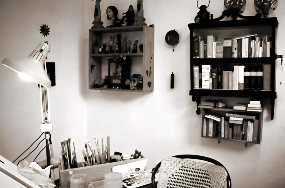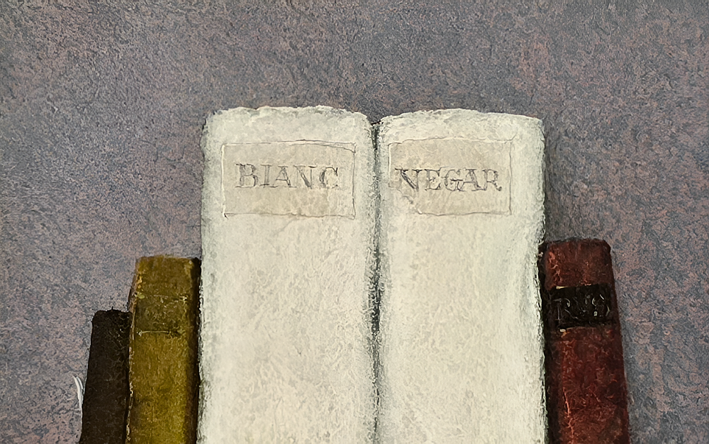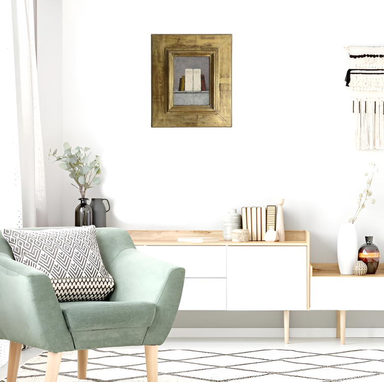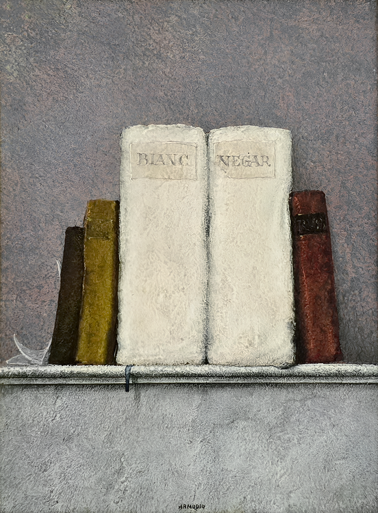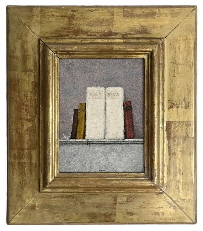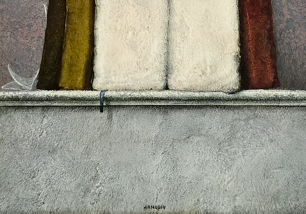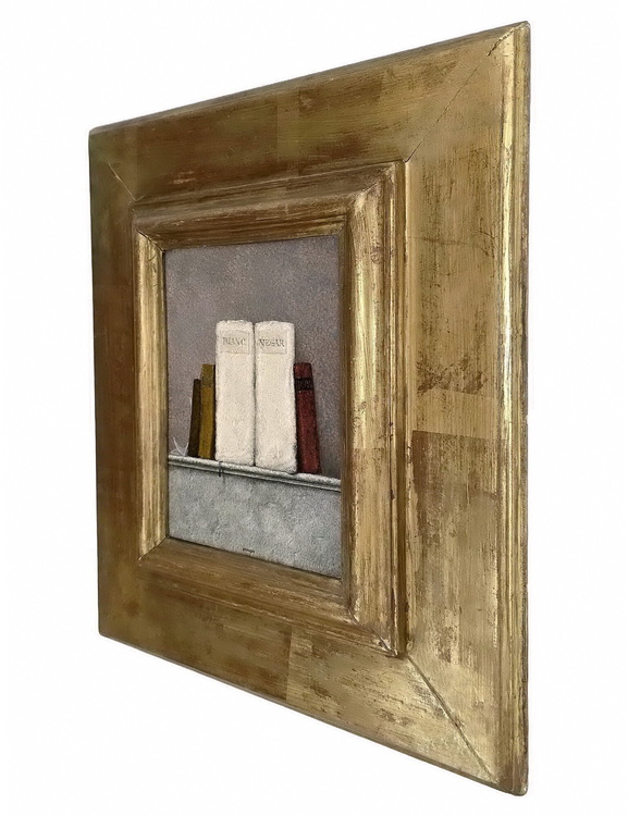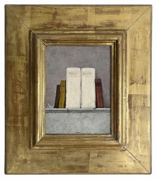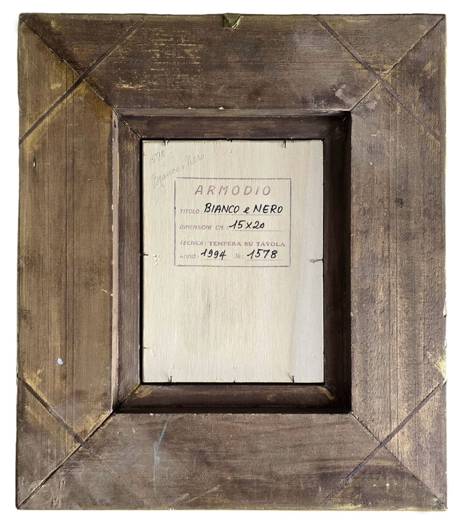 Cm. 20 x 15 (cm. 39,5 x 34,5 entro bellissima cornice lignea di metà Novecento lavorata a foglia oro e scelta allo scopo direttamente dall'artista). Tempera su tavola di legno. Firmata “Armodio” in basso al centro. Ottimamente conservato. Timbro dell'artista al retro (con i dati dell'opera e il riferimento d'archivio nr. 1578). Opera pubblicata in “Armodio, Catalogo generale delle opere, volume II”, a cura di Silvia Bonomini, Milano, Ed. Giorgio Mondadori, 2022, p. 31, fig. 36. Pubblicata altresì nella monografia curata da Giorgio Soavi e Marilena Pasquali “Armodio, il Mestiere dei Libri da Casanova a Armodio”, Piacenza, Ed. Braga, 1994, p. 141, fig. 146. Certificato di autenticità della galleria di provenienza. Questo splendido e iconico dipinto vede due libri simboleggiare idealmente l'universalità della conoscenza. “Bianco e nero” sui tasselli applicati ai dorsi (“bianc e negar” in dialetto piacentino), ovvero tutto e il contrario di tutto. Armodio, come accade nei lavori più intensi a partire dalla fine degli anni Ottanta, sceglie il libro antico come veicolo di un urgente messaggio di cultura. Elementi solo apparentemente secondari nella composizione, sono i tre libri posti a sostegno dei due primari e centrali e soprattutto il documento quasi impercettibile che appare solo velatamente, appoggiato all'ultimo libro di sinistra. Un ulteriore e inconfondibile segno distintivo armodiano di natura quasi metafisica è il segnacolo, con la sua conseguente ombra, che fuoriesce dal libro e si adagia lungo il muro. Il particolare pregio del dipinto è anche legato alla data di realizzazione che vede all'opera l'artista poco più che cinquantenne, ovvero nel pieno della maturità espressiva e ben lontano dai parametri della inevitabile ripetitività. Per Vittorio Sgarbi, che riprese la definizione che Vasari diede di Andrea del Sarto, è il “pittore senza errori”, evidenziando la perfezione delle forme nelle sue opere.