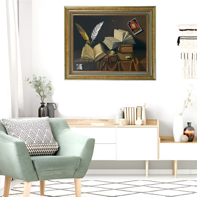 Cm. 60 x 80 (cm. 78 x 98 con bella cornice lignea del tempo lavorata a foglia d'oro). Firmato e datato in basso a sinistra. Olio su tela. Trascurabili segni del tempo, peraltro cornice e dipinto in ottimo stato di conservazione. Opera corredata di certificato di autenticità della Galleria L'Artistica di Genova che trattava in esclusiva le opere del pittore genovese e archiviata il 18/01/2000 presso la medesima galleria al nr. 067 STB/1-054. Stupenda natura morta metafisica a soggetto librario dedicata esplicitamente (come si evince dal titolo autoriale e dal ritratto dell'artista dedicatario presente in alto a destra) al grande pittore fiammingo Jan van Eyck (1390-1441), artista di fama internazionale caratterizzato da un inconfondibile stile incentrato su una resa analitica della realtà. Van Eyck fu incline a dipingere sovente soggetti librari e fu anche il perfezionatore della tecnica della pittura ad olio, che gradualmente sostituì in Europa l'uso del colore a tempera. Stupenda natura morta metafisica a soggetto librario di Bruno Stobbione (1926-1996), raffinato artista genovese che studiò al Liceo Artistico, si diplomò all'Accademia Ligustica di Belle Arti di Genova e fu allievo del grande Gregorio Sciltian. Ha al suo attivo 53 mostre personali e molte partecipazioni a manifestazioni in Italia e all'estero dove ha sempre ottenuto così grandi successi di critica e di pubblico da essere considerato uno dei massimi esponenti internazionali del “Realismo Magico” insieme, tra gli altri, a Gregorio Sciltian, Alfredo Serri, Celada da Virgilio, Cagnaccio di San Pietro, Antonio Donghi, Mario Broglio e Ubaldo Oppi ecc. Il suo stile nelle nature morte sembra tendere al surrealismo per quanto riguarda la composizione e all'Iperrealismo nella forma. Si nota una volontà di riportare sulla tela oggettivamente, con fredda lucidità, gli elementi dei suoi bizzarri pastiches. Stobbione è in possesso di una notevole tecnica, che ricorda la pittura fiamminga, nella precisione con cui riproduce i vari materiali e gli effetti della luce incidente su di essi. Nonostante la sua oggettiva evidenza e pur evitando effetti atmosferici troppo accentuati, la tecnica di Stobbione è tale da inserire in modo naturale gli oggetti nello spazio, con una continuità e indefinitezza di contorni. “I colori dalle preziosità che si stemperano in luce, penombra e ombra, mettono particolarmente in risalto la partecipazione intensa di Stobbione al mondo delle cose: egli ci rivela quanto vibrante e ricco d'ispirazione possa essere un libro antico composto assieme ad un drappeggio […] lo spazio in vastità scandita su cui far scivolare lo sguardo e tramutarlo in sogno” (G. Jelenkovic). “Il Realismo magico di Bruno Stobbione si riconnette a quello di Sciltian, aggiungendovi un pizzico di surrealtà alla Dalì ed un altro modesto accenno dechirichiano” (Franca Bissoni). Bibliografia: Annuario Comanducci, 88; Catalogo Bolaffi, Volume “Pittura e scultura d'oggi in Liguria”, 1970; Catalogo illustrato d'arte moderna, Milano, 1971; L'arte Contemporanea in Italia, Roma 1971; Traguardi dell'Arte '70, Roma 1972; Enciclopedia Internazionale Artisti Contemporanei, Roma 1970; Pittori Scultori Critici e Collezionisti, Roma 1971-72; Selezione biennale d'arte di pittori italiani, Torino 1972; Enciclopedia dell'arte contemporanea, Pavia 1973; American book on italian painting, Milano 1971 .
