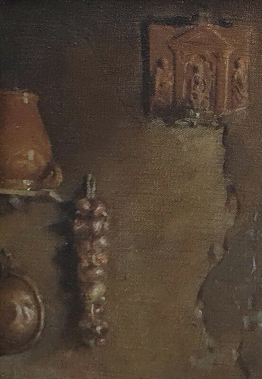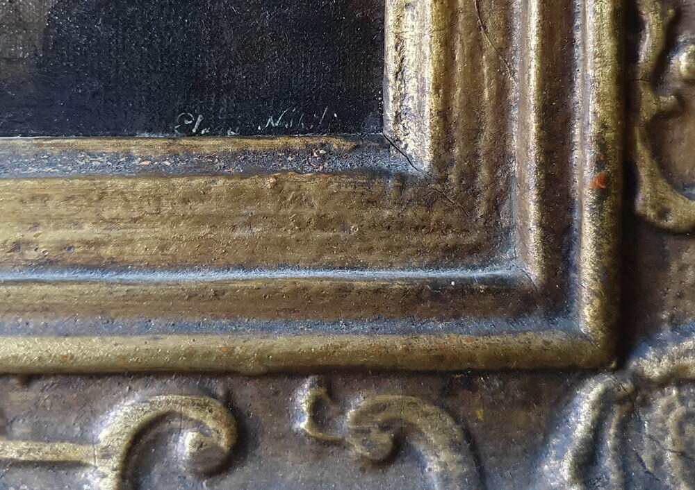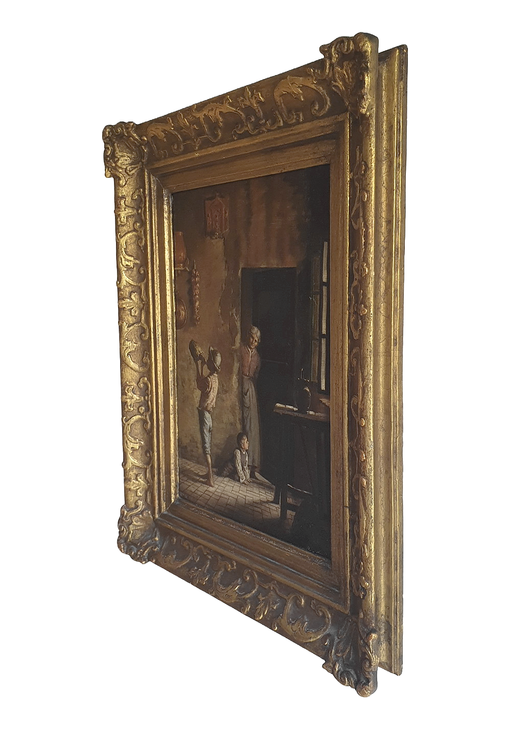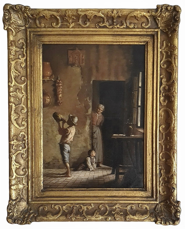 Cm. 35 x 25 (cm. 49 x 39 con bellissima cornice lignea di fine Ottocento firmata Anton Rutger di Amburgo). Olio su prima tela, telaio strettamente coevo. Firmato in basso a destra “Elena Nobili”. Ottimamente conservato. Opera accompagnata da certificato di autenticità rilasciato da perito accreditato presso il Tribunale di Trento. Certificato di autenticità della galleria di provenienza. La scenetta, ambientata in una cucina rustica, raffigura un ragazzino che beve di nascosto dal fiasco di vino, ma non si accorge della madre che lo osserva nascosta dietro il vano della porta, guardata curiosamente dal sotto in su dal fratellino, carponi sul pavimento. Elena Nobili (1833-1900), pittrice fiorentina, fu la madre del celebre pittore e scrittore Riccardo Nobili (1859–1939). Una sua tela dal titolo “Reietti!” fu esposta a Torino nel 1884 e la Bonaccia fu presentata alla Promotrice di Firenze del 1884. Alla Esposizione Beatrice di Lavori al femminile, che si svolse al Calendimaggio fiorentino del 1890, per le sue opere pittoriche Elena Nobili ottenne la medaglia d'argento che portava sul retro il giglio di Firenze. Predilesse dipingere opere di genere (come nel nostro caso) - scene di interno familiare con bambini e le loro mamme, passeggiate campestri, ricorrenze festose o dolorose trascorse in famiglia - usando una tavolozza di tinte luminose e delicate e un linguaggio espressivo facile ed immediato. Fu notata ed apprezzata da Angelo de Gubernatis che la inserì nel suo Dizionario degli Artisti Italiani Viventi del 1889. La sua riscoperta e rivalutazione è di data recente. Cfr. Comanducci, Pittori italiani dell'Ottocento, ed. 1934, p. 473; Benezit, Dictionnaire des Peintres, vol. VI, p. 371.