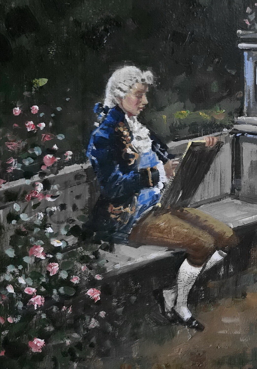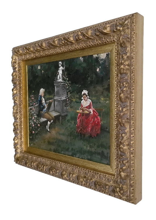 Cm. 26,5 x 32 (cm. 39 x 44,5 con bella cornice in stile lavorata a foglia oro). Olio su tavola lignea. Firmato “F. Cipolla” in basso a destra. Trascurabili segni del tempo al retro della tavola, dipinto nel complesso ben conservato. Opera accompagnata da certificato di autenticità rilasciato da perito accreditato presso il Tribunale di Salerno. Certificato di autenticità della galleria di provenienza. Questa raffinata e luminosa tavoletta raffigura una scena quotidiana ambientata nel Settecento che vede un uomo realizzare un ritratto di una dama immortalata in uno spensierato momento di lettura. Fabio Cipolla (Roma 1852 – 1935) si specializzò nella pittura di genere e in argute scenette quotidiane, spesso ricostruzioni settecentesche con sensuali figure femminili intente nelle più disparate attività che costituiscono tutta la prima fase di produzione del pittore degli anni Settanta ed Ottanta. In seguito si dedicò anche alla produzione di paesaggi nella campagna di Olevano e inizia anche a esporre alcune figure orientaliste, sorrette da un disegno impeccabile e da fantasia cromatica e compositiva. All'Esposizione Nazionale di Torino del 1880 presenta un vivace Costume arabo che lo fa notare dalla critica, così come avviene per il dipinto di genere esposto a Milano nel 1881. Nel 1883, partecipa alla Mostra Nazionale di Roma con un altro costume orientalista. I suoi dipinti furono accolti positivamente dalla critica per la loro “eccellente fattura”. Cipolla con il passare del tempo abbraccia un verismo luminoso ma ricco anche di dettagli artificiosi e manierati, che attirano il mercato europeo ed in particolare quello francese. Nel 1904 Cipolla entra nel Gruppo dei XXV della Campagna Romana, contribuendo soprattutto con vedute popolate da figure in abiti tradizionali e con dipinti di costume realizzati ad olio, tempera o acquarello. Un cromatismo squillante e veloce e una narrazione leggera ma ormai matura portano il pittore romano a partecipare alla Biennale di Venezia del 1905 con un soggetto di genere. Compare poi anche alla Mostra Internazionale di Roma del 1911 e nel corso del Novecento è spesso presente alle Mostre degli Amatori e Cultori di Belle Arti. Portando avanti fino a tutti gli anni Venti la sua frizzante e briosa pittura di genere, Fabio Cipolla opera anche delle piccole incursioni nella pittura allegorica Tra gli anni Dieci e Venti del Novecento, la sua produzione, legata maggiormente ad un andamento liberty, si riempie di ritratti e di figure femminili ritratte nella loro aristocratica eleganza. Tra i paesaggi più significativi di Fabio Cipolla si segnalano Inverno, Autunno in città e Interno di paese che è conservato alla Galleria d'Arte Moderna di Roma. Bibliografia: Benezit, Dictionnaire des peintres, Sanit-Ouen, 1948/57, III, p. 516; Comanducci, Dizionario illustrato dei pittori, II, 746; Comanducci, I pittori italiani dell'Ottocento; De Gubernatis, Dizionario artisti italiani; L'Illustrazione Italiana, Milano, Treves, II semestre, Anno IV, n. 33, 15 agosto, p. 97; L'Illustrazione Italiana, Milano, Anno XXI -Treves, II semestre, p. 415; LXXVIII Esposizione Internazionale di Belle Arti, catalogo mostra, Società Amatori e Cultori di Belle Arti in Roma, p. 11; La Biennale di Venezia. Le Esposizioni Internazionali d'Arte 1895-1995, Electa 1996, pp. 362/363.