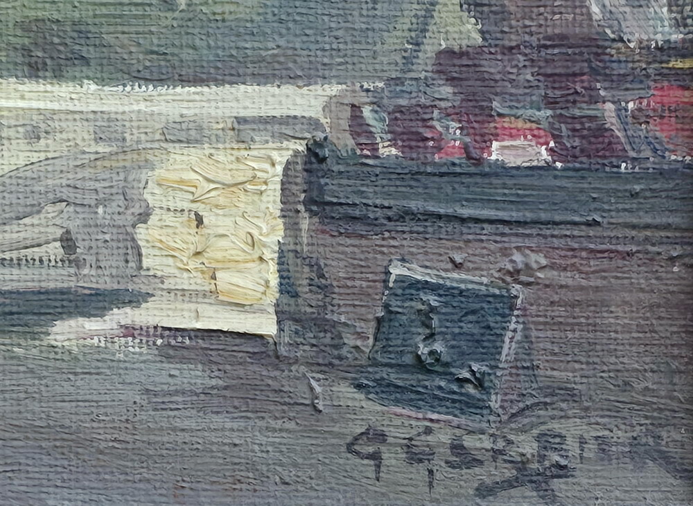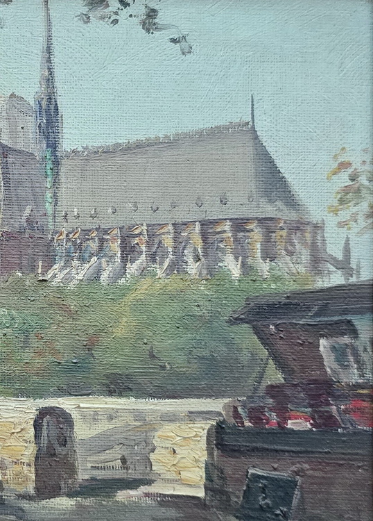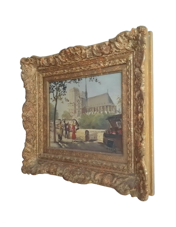 Cm. 19 x 24 (cm. 32 x 38 con bellissima cornice lignea strettamente coeva). Olio su tela. Firmato “G. Gerbier” in basso a destra. Ottimamente conservato. Certificato di autenticità della storica Galleria Flori di Montecatini Terme. Georges Gerbier (1906-1983), pittore post-impressionista francese, si guadagnò grande fama intorno alla metà del Novecento, grazie alle sue iconiche scene cittadine raffiguranti i luoghi popolari di Parigi. Le sue opere si caratterizzano per i colori vivaci e le pennellate intense e armoniose. Questo delizioso dipinto a olio su tela, tipico esempio dello stile pittorico dell'artista, ritrae alcuni bouquinistes della Senna (veri e propri simboli della Parigi di ieri e di oggi), con la cattedrale di Notre Dame sullo sfondo. A testimonianza della grande popolarità di Gerbier si registrano numerosi passaggi in asta anche presso Dorotheum, Sotheby's e Christie's.