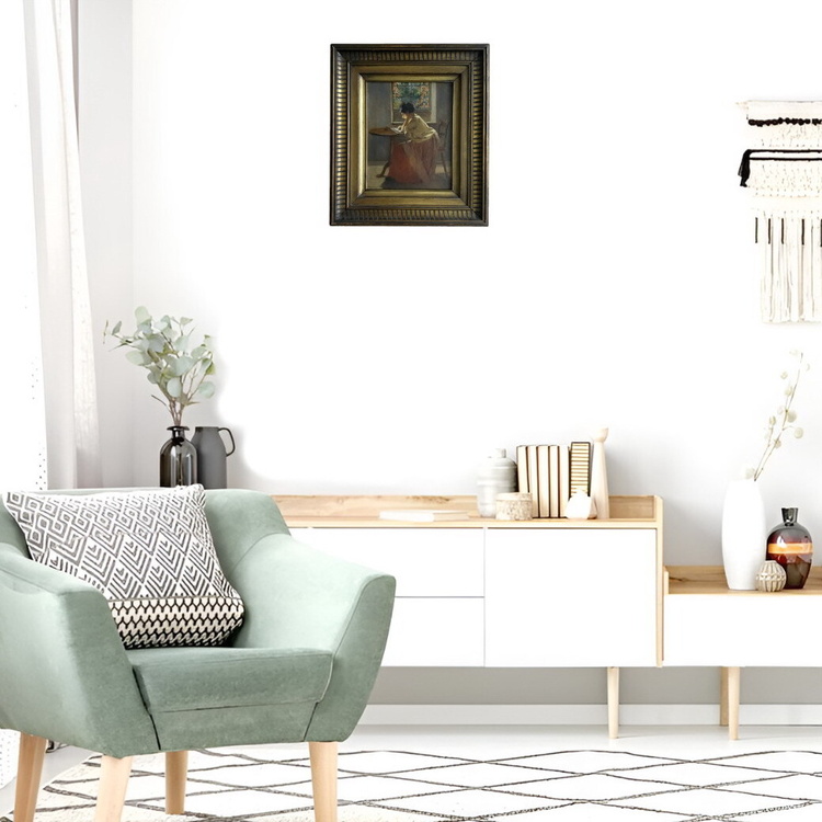 Cm. 27,5 x 22 (cm. 41,5 x 36,5 con cornice lignea posteriore ma molto datata, telaio strettamente coevo). Olio su tela (dipinto in prima tela). Firma poco leggibile in basso a destra con il monogramma iniziale HK ancora ben decifrabile. Al retro (sul margine esterno della tela fissata al telaio) nitida firma dell'artista “Haynes King” e annotazione manoscritta di mano coeva che menziona il titolo dell'opera “The love letter”. Minimi ritocchi in punti secondari. Ben conservato. Certificato di autenticità della galleria di provenienza. Opera accompagnata da certificato di autenticità rilasciato da perito accreditato presso il Tribunale di Trento. Il soggetto, una giovane donna di popolo seduta e intenta a scrivere una lettera d'amore posata su un libro aperto, fu più volte ripetuto dall'artista inglese (1831-1904). Haynes King nacque nell'isola di Barbados nel 1831, all'epoca colonia dell'Impero britannico. Nel 1854 l'artista si trasferì a Londra dove studiò arte presso la Leigh's Academy. Iniziò ad esporre le sue opere nel 1857 alla Society of British Artists che lo accolse successivamente come membro nel 1864. Molti dei suoi dipinti furono esposti alla Royal Academy of Arts e tra il 1860 e il 1904 l'artista vi presentò ben 48 opere. Le opere di King rappresentano per la maggior parte soggetti umani, in molti casi ritratti in ambienti domestici e popolari. La sua opera più famosa “Jealousy and Flirtation”, dipinta nel 1874 ed esposta nello stesso anno alla Royal Academy of Arts, è attualmente compresa nella collezione del Victoria and Albert Museum di Londra. Bibliografia: Sidney Lee, "King Haynes" in Dictionary of National Biography (2nd supplement). Vol. 2. London, Smith, Elder & Co., 1912; Anne Pimlott Baker, Oxford Dictionary of National Biography (online ed.). Oxford University Press.