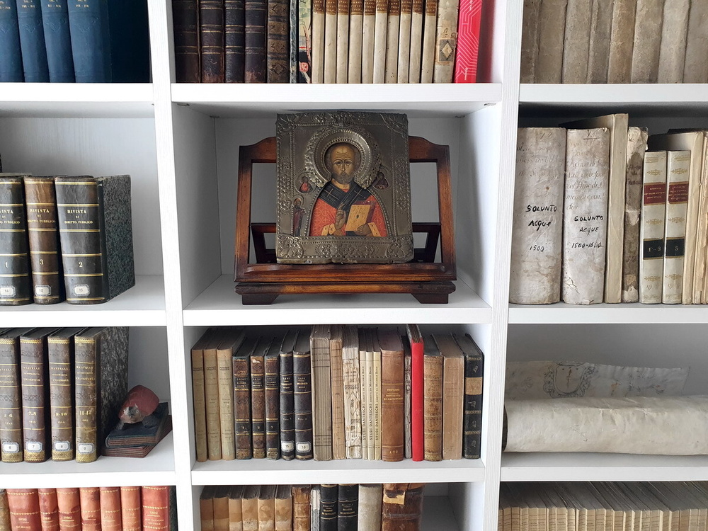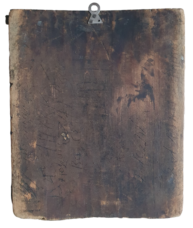 Cm. 31 x 25,5 (spessore della tavola di legno circa 3 cm). Icona di area bielorussa, riza metallica lavorata a sbalzo con motivi floreali e iscrizioni in cirillico. Minimi ritocchi in parti secondarie. Complessivamente buono lo stato di conservazione. Opera visionata da perito accreditato presso il Tribunale di Trento e ritenuta congrua con l'epoca qui dichiarata. Certificato di galleria. Genuina icona di scuola bielorussa che presenta il personaggio in basso a sinistra (il committente) inserito in modo anomalo (e quasi eretico) nel campo pittorico che nella cultura ortodossa di questa tradizione iconografica è dedicato ai soli santi.
