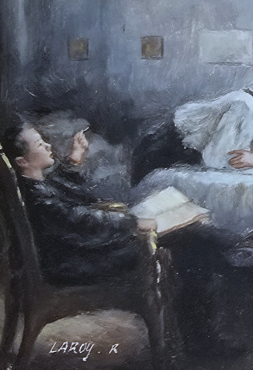 Cm. 13 x 18 (cm. 28,5 x 33,5 con elegante cornice lignea in stile, protetto da vetro). Firmato in basso a sx R. Laroy (pittore francese). Olio su tavola in cartoncino rigido. Certificato di galleria. Raffinata reinterpretazione del celebre dipinto di Leonid Pasternak (La vigilia dell'esame, 1895) conservato al Musee d'Orsay di Parigi (se ne conosce anche una seconda versione venduta in asta internazionale) con la figura maschile in lettura seduta a sinistra sostituita dall'artista con una figura femminile e con il teschio in mano alla figura maschile barbuta sostituito con un mappamondo.
