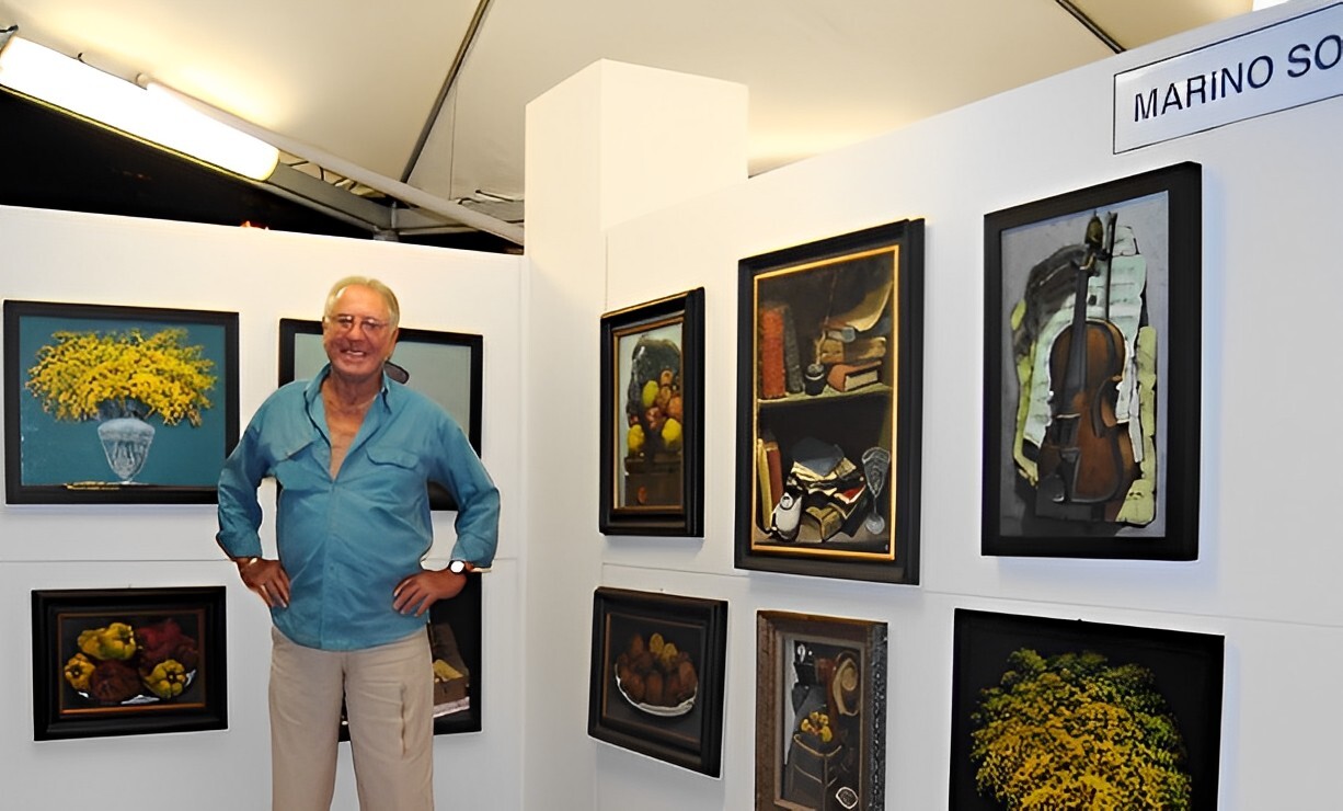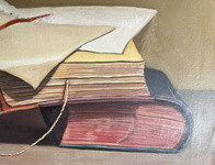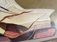 Cm. 50 x 70 (cm. 71 x 91 con cornice lignea strettamente coeva lavorata a foglia d'oro, passpartout in velluto bordeaux ben preservato). Raffinato olio su tela, di stile nitidamente iper-realista. Firmato e datato dall'artista in basso a sx. Controfirma dell'artista a mo' di autentica al retro con indicazione manoscritta sempre di mano dell'artista “Vecchia strada di S. Marcello” relativa a un'esposizione del dipinto. Ottimo stato di conservazione. Esposizioni: Mostra organizzata dal Comune di San Marcello Pistoiese (firma del responsabile dell'organizzazione, timbro comunale e numero di esposizione apposti all'angolo basso del retro della tela). Bellissima natura morta libraria di grande formato, realizzata con raffinata tecnica iperrealista evidentemente influenzata dagli artisti del cosiddetto realismo magico molto attivi sul tema. Nato a Livorno, Marino Socci ha frequentato la scuola d'arte di Gastone Benvenuti ed è stato allievo di Ferruccio Mataresi. Le sue opere sono in permanenza in note gallerie toscane e protagoniste di numerose mostre pubbliche organizzate nella città di Livorno. Nel 1978 Socci fu tra i fondatori del “Gruppo Silvestro Lega” insiema a Stefano Bottosso, Aldo Mazzi, Fiorenzo Luperini, Piero Pastacaldi, Bruno Loretti, Paolo Paoletti e Armando Lippi. Gli artisti si proclamarono seguaci dei macchiaioli nella pittura dal vero e, portatori di tali intenti artistici, organizzarono una mostra a Livorno nella storica Bottega d'Arte e a Firenze presso la galleria Spinetti.