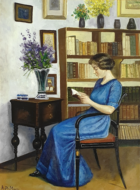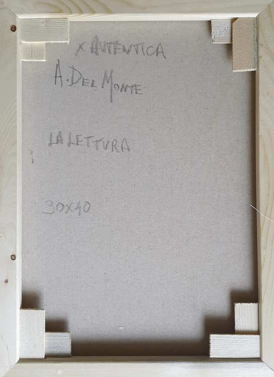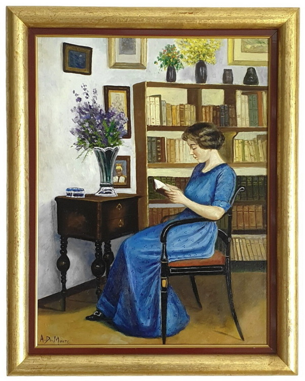 Cm. 40 x 30 (cm. 46 x 36 con bellissima cornice lignea tondeggiante lavorata a foglia d'oro). Olio su tela. Firmato in basso a sinistra “A. Del Monte” e al retro “per autentica A. Del Monte, La lettura”. Certificato di galleria. Ottimamente conservato. Poul Friis Nybo (1869–1929), pittore danese, realizzò l'opera originale (cm. 63,5 x 49) tra la fine dell'Ottocento e gli inizi del Novecento. L'artista si dedicò perlopiù a delicate scene di interni, paesaggi e marine. I suoi interni sono particolarmente interessanti e catturano un'istantanea della vita quotidiana femminile. Nybo si formò alla Royal Academy of Fine Arts di Copenaghen prima di frequentare la scuola di Kristian Zahrtmann. Il maestro Del Monte è un pittore napoletano vivente e attivo a Parigi, conosciuto e collezionato per le sue raffinate copie e reinterpretazioni di opere realizzate tra la fine del Settecento e gli inizi del Novecento.