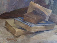 Cm. 49 x 60,5 (cm. 56 x 67 con bella cornice lignea coeva lavorata a foglia d'oro). Olio su tavola di compensato. Firmato e datato in basso a sinistra “Garin 44”. Provenienza: “Atelier Garin - Catherine Charbonneux Commissaire Priseur” (timbro scolorito sul retro in basso a destra – le opere dell'Atelier Garin furono vendute nel 1998 all'Hôtel Drouot di Parigi, commissario d'asta Catherine Charbonneux), poi collezione privata di Milano. Ben conservato. Certificato di galleria. Deliziosa natura morta con libri e fiori, caratterizzata da una tonalità delicata e soffusa del colore, sapientemente desaturato dall'artista con il preciso intento di ricondursi idealmente alle atmosfere pittoriche ottocentesche. Paul Garin (1898-1963), artista francese nativo di Nizza, dopo i primi studi in diritto, si dedicò alla pittura, dedicandosi a molteplici soggetti, spesso riconducibili alla sua terra d'origine: dipinse paesaggi provenzali, porti della Costa Azzurra, scorci di Nizza, nature morte (spesso di soggetto librario), ritratti e nudi femminili. Nella sua produzione si ritrovano opere (alcune delle quali sono conservate nel Museo di Nizza) ad olio, acquerelli e disegni a carboncino/inchiostro.