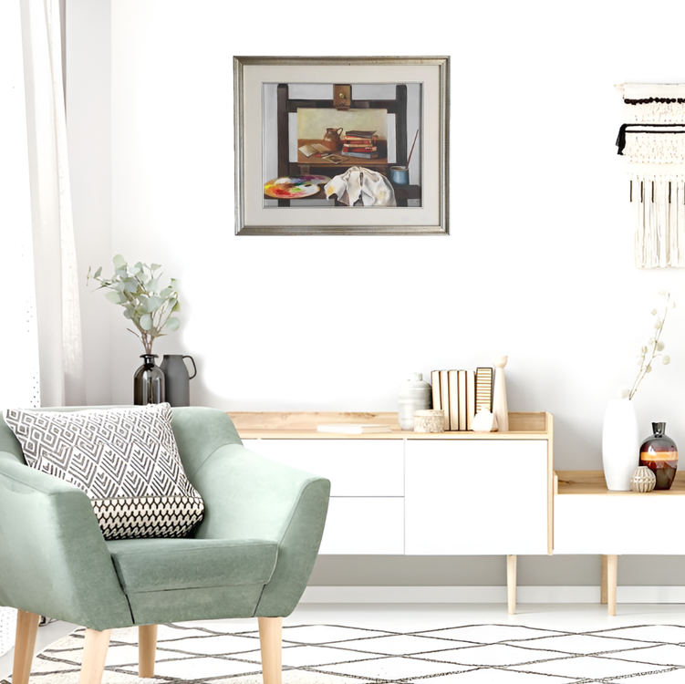 Cm. 40 x 50 (cm. 54,5 x 64,5 con elegante cornice lignea del tempo). Olio su tela. Firmato e datato “Pivi L. 7[?]” in basso a destra. Ottimo stato di conservazione. Certificato di galleria. Quest'intrigante e raffinata opera novecentesca racconta uno scorcio di studio d'artista, con cavalletto, tavolozza, straccio e dipinto, raffigurante una classica natura morta con vecchi libri e brocca. Interessante ed evocativa è l'idea di inserire un dipinto nel dipinto, soluzione pittorica già sperimentata nei secoli passati e oggi molto veicolata grazie ai lavori metafisici di Antonio Nunziante. Non si conoscono i dettagli biografici dell'artista, verosimilmente di origine emiliana. Fu attivo a Torino nella seconda metà del Novecento e si dedicò, sempre fedele a uno stile realista, alla natura morta, ai mestieri e alle vedute animate di mercati cittadini, tema a cui dedicò un ciclo di lavori realizzati tra il 1975 e il 1978 (ndr sono documentabili fotograficamente numerose opere realizzate da Pivi tra il 1956 e il 1985; il suo primo dipinto raffigura un paesaggio lacustre, risale al Settembre 1956 e fu eseguito su uno straccio da cucina).