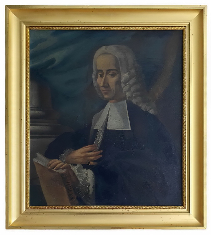 Cm. 70 x 60 (cm. 82,5 x 72,5 con bellissima cornice moderna in stile lavorata a foglia d'oro). Olio su tela di scuola italiana. Opera rintelata con antichi ritocchi a puntinatura sulla figura e ritocchi di media entità di epoca più recente su parti secondarie. Complessivamente buono lo stato di conservazione. Opera accompagnata da certificato di autenticità rilasciato da perito accreditato presso il Tribunale di Trento. Austera ed iconica rappresentazione di un giurista togato con in mano il Codex di Giustiniano rilegato in piena pergamena con titoli al dorso secondo la tipica tradizione italiana. Di grande impatto scenico la colonna e il drappo retrostanti la figura. Le tonalità scure del dipinto richiamano pittoricamente il secolo precedente.