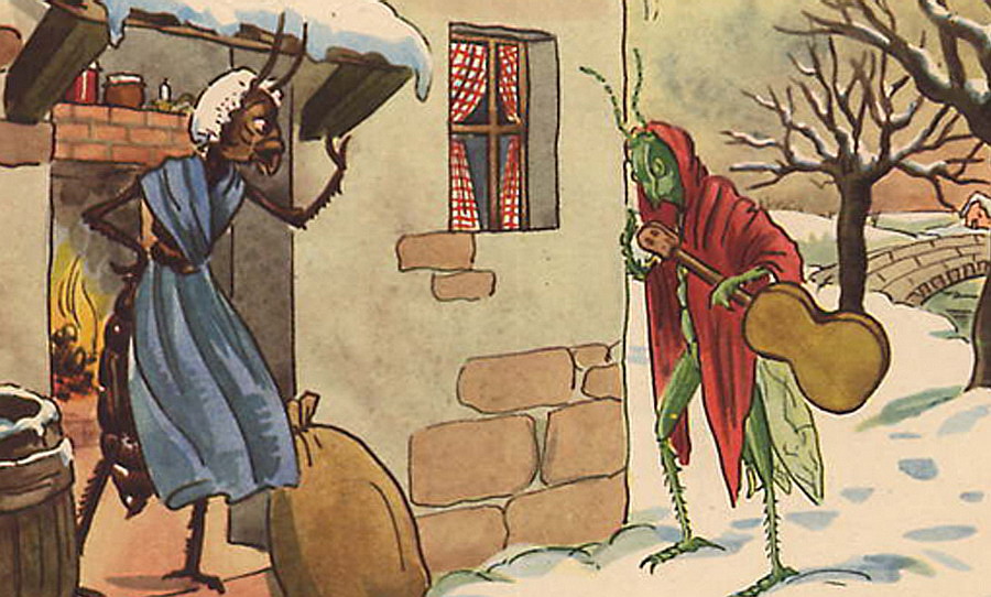 Era inverno, e le formiche stavano asciugando il loro grano, che si era bagnato. Ed ecco che una cicala affamata andò a chiedere loro del cibo. Ma le risposero le formiche: «Perché durante l'estate non hai fatto anche tu provviste?». Rispose la cicala: «Non ne avevo tempo, ma cantavo armoniosamente».