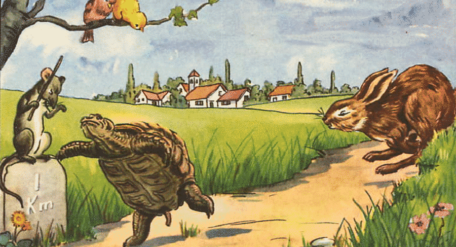 La tartaruga invece, consapevole della sua lentezza, non smise mai di correre, e così, sorpassata la lepre che seguitava a dormire, conseguì la palma della vittoria. La favola dimostra che spesso l'impegno ha la meglio sui pregi naturali, se questi non sono messi a frutto.