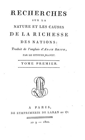 Recherches sur la nature et les causes de la richesse des nations: traduit de l'anglais d'Adam Smith par le citoyen Blavet. A Paris, de l'Imprimerie de Laran et C., 1800-1801