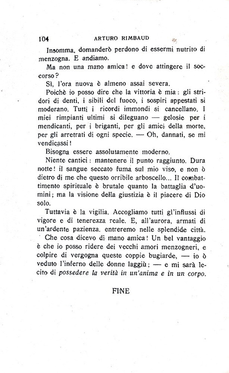 Cm. 18,5, pp. 106 + (6) di catalogo editoriale. Con un bel ritratto fotografico di Rimbaud f.t. Brossura originale con titolo e logo tipografico in rosso. Timbretto di libreria al piede del piatto posteriore. Trascurabili segni del tempo alla brossura. Lievi/marginali fioriture e ordinaria patina del tempo alle estremità delle pagine dovuta alla qualità della carta usata nel periodo post-bellico. Esemplare nel complesso ben conservato, ancora intonso a fogli chiusi. Ricercata prima edizione italiana dei “Poemi in prosa” del grande poeta francese nativo di Charleville, Arthur Rimbaud (1854-1891). Singolare il ritardo della cultura italiana, ancora segnata da parametri letterari in parte ottocenteschi, nella ricezione del sommo poeta simbolista (l'edizione originale di Une saison en enfer è del 1873, quella delle Illuminations del 1886; Rimbaud si era spento nel 1891). “Ma il procedimento di distruzione della retorica, oltreché della poetica tradizionale, la riconquista dell'assoluta verginità della parola, secondo i dettami di Baudelaire, si trova nei "Poemi in prosa": qui si assiste alla magica scomposizione e ricomposizione di un mondo delle esperienze sensibili, secondo un ordine assolutamente fantastico" (Mario Bonfantini, in Bompiani 1959: vol. V pp. 240-241). Ha ricordato in un'intervista Alfredo Giuliani come il suo primo incontro con la lirica di Rimbaud nascesse proprio da questa traduzione: "Non avevo ancora 15 anni e qualcuno mi regalò Una stagione all' inferno e Le Illuminazioni di Arthur Rimbaud. La traduzione era di un certo Oreste Ferrari, restai incantato da quel libro". Cfr. Arthur Rimbaud, Opere complete, Einaudi-Gallimard, 1992, p. 1367.