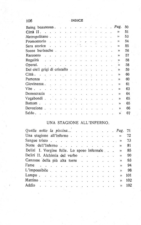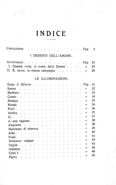 Poemi in prosa. I deserti dell'amore. Le illuminazioni. Una stagione all'inferno. Traduzione di Oreste Ferrari. Milano, Casa Editrice Sonzogno, (1919).