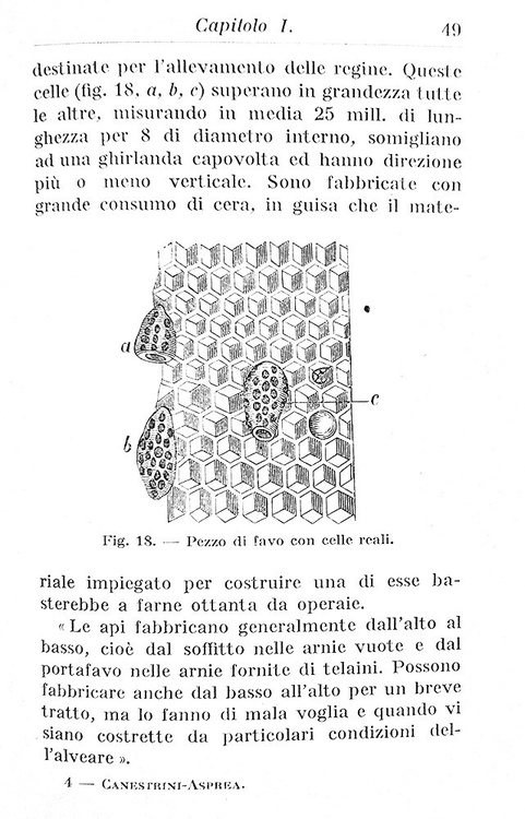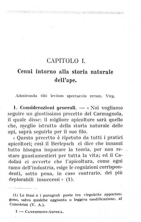 Cm. 14,5, pp. viii, 239 (1) + 64 di catalogo editoriale. Con 55 figure incise nel testo. Legatura editoriale in piena tela illustrata. Bell'ex-libris applicato al verso della carta bianca preliminare. Trascurabili segni del tempo. Esemplare nel complesso fresco e ben conservato. Giovanni Canestrini (Revò 1835 – Padova 1900) fu insigne biologo, naturalista e aracnologo. Ebbe un ruolo fondamentale nell'introduzione in Italia delle teorie di Charles Darwin sull'evoluzione, traducendo le sue opere e diffondendo il suo pensiero. Preziosa e interessante trattazione sulla conoscenza e l'allevamento delle api. Curiosi i disegni. Ottava edizione riveduta e ampliata da Vincenzo Asprea (1874-1930), celebre entomologo nativo di Reggio Calabria, reputato tra i più insigni esperti italiani in tema di apicoltura. Collana “Manuali Hoepli”. Cfr. Iccu; Assirelli, p. 53.