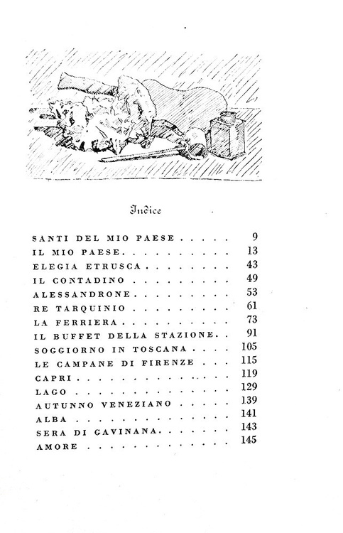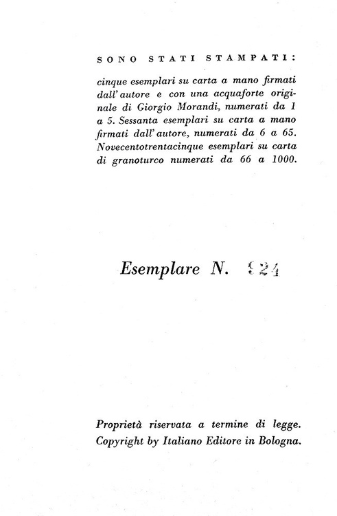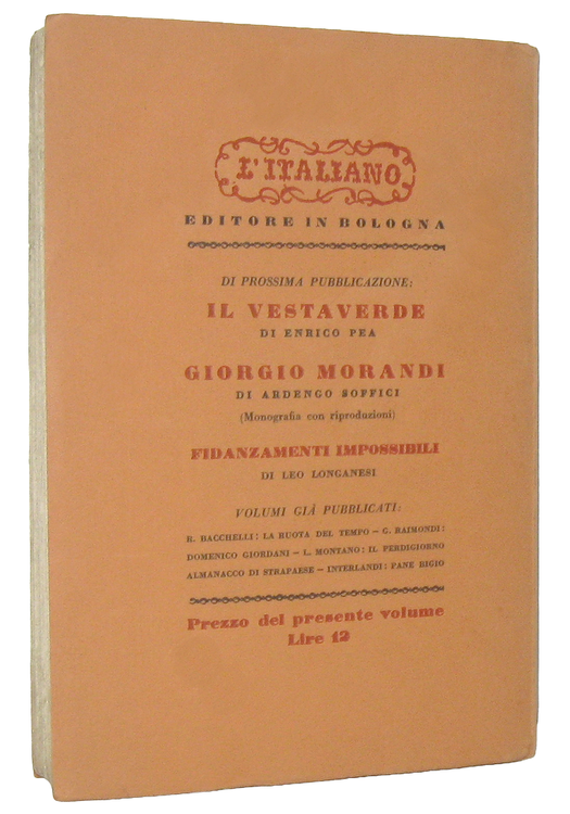 Cm. 19, pp. 166 (2). Brossura editoriale color arancio con titolo in rosso e nero e vignetta in tinta rossa di Giorgio Morandi, cui si debbono anche la vignetta al frontespizio e le 22 illustrazioni in bianco e nero intercalate n.t. Esemplare nel complesso fresco e ben conservato. Vincenzo Cardarelli, nato Nazareno Caldarelli (Corneto Tarquinia 1887 - Roma 1959), fu poeta, scrittore e giornalista. La sua fama resta legata alle numerose poesie e prose autobiografiche di costume e di viaggio. Condusse una vita vagabonda e solitaria (tranne una breve convivenza giovanile con la scrittrice Sibilla Aleramo) e di austera dignità. I suoi riferimenti letterari sono stati Baudelaire, Nietzsche, Leopardi, Pascal, che lo hanno portato ad esprimere le proprie passioni con un senso razionale, senza troppe esaltazioni spirituali, anche se fu apertamente cattolico. Non comune e ricercata prima edizione impressa in 1.000 esemplari numerati su carta di granoturco (ns. copia nr. 924) di questa raccolta di prose d'arte di Cardarelli, uno dei vertici della produzione letteraria della scuola della Ronda. L'opera vinse il Premio Bagutta nel 1929. Cfr. Iccu; Spaducci, p. 76; Gambetti-Vezzosi, Rarità bibliografiche del Novecento italiano, pp. 178-179: “ molto ricercato”.