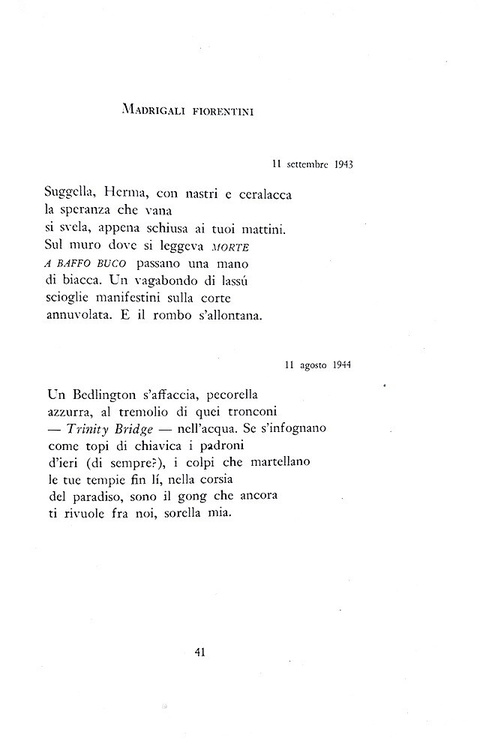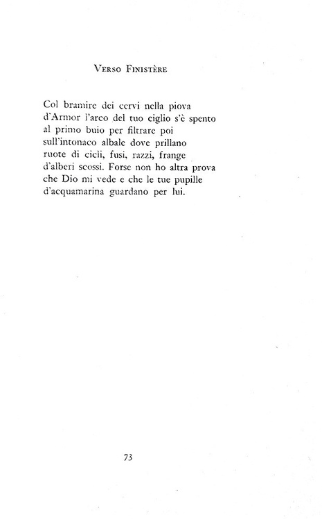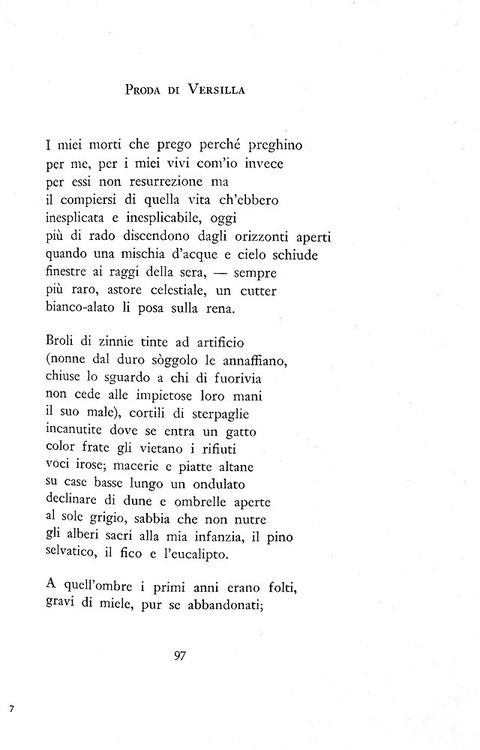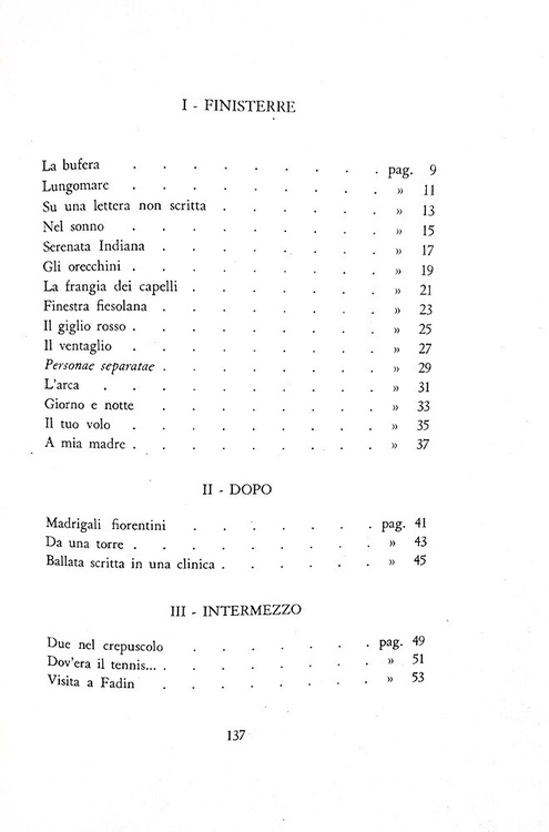 Cm. 21, pp. 139 (3) + 1 c.b. Brossura editoriale verde a due colori. Impercettibili segni del tempo. Esemplare nel complesso fresco e ottimamente conservato. Ricercata prima edizione (tiratura limitata di 1000 esemplari non numerati) della terza raccolta di poesie di Eugenio Montale, dopo «Ossi di seppia» e «Occasioni». Comprende la suite «Finisterre», già pubblicata come libro autonomo in ben due edizioni negli anni Quaranta e altri componimenti successivi (suites «Flashes e dediche» e «Silvae»). Cfr. Iccu; Barale, Bibliografia montaliana, A53; Gambetti-Vezzosi, p. 552: “Edizione abbastanza ricercata”.