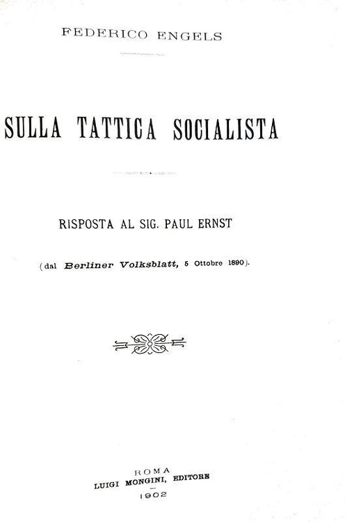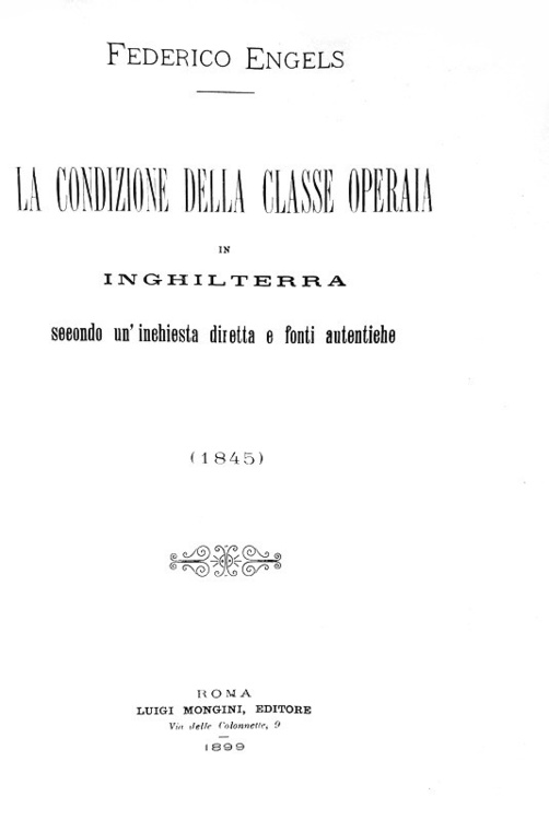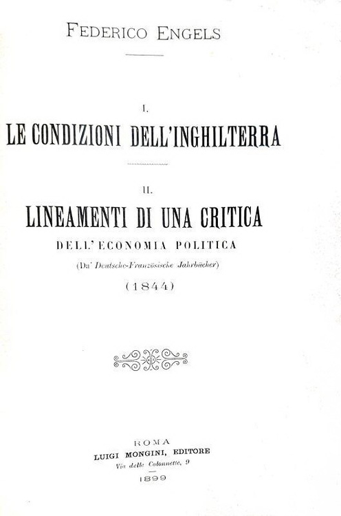 Diciassette opere in un volume di cm. 24, pp. 1.300 ca. complessive. Legatura del tempo in piena tela con titoli in oro su tassello in pelle. Trascurabili segni del tempo e sporadiche macchiette, peraltro esemplare nel complesso ben conservato. Friedrich Engels (1820 - 1895), celebre filosofo ed economista tedesco, fondò insieme all'amico Karl Marx il socialismo scientifico, attraverso la scrittura a quattro mani de L'Ideologia tedesca (1846) e del Manifesto del Partito comunista (1848). Teorizzò il materialismo dialettico basandosi in particolare sull'impostazione critica in chiave materialista dell'intera storia umana. Figlio di un proprietario di grandi fabbriche tessili in Inghilterra e Prussia, ricoprì un ruolo di spicco nei movimenti comunisti, socialisti e operai del tempo. Fu anche capo politico sia della Prima Internazionale (1864) sia della Seconda Internazionale (1889). Alcune opere di importanza capitale per la storia dell'economia ottocentesca sono presenti in questa raccolta: La sacra famiglia (scritto insieme a Karl Marx nel 1845); La condizione della classe operaia in Inghilterra (1845); L'evoluzione del socialismo dall'utopia alla scienza (1880); La guerra dei contadini (1850); Per la questione delle abitazioni (1872); Le condizioni dell'Inghilterra. Lineamenti di una critica dell'economia politica (1844). Questo è il dettaglio delle rarissime 17 prime edizioni italiane raccolte nel presente esemplare: Savoia, Nizza e il Reno (1860). Roma, 1908. Pp. 36. La sacra famiglia ossia Critica della critica critica contro Bauer e consorti. Roma, 1909. Pp 193 (3) [scritto insieme a Karl Marx]. La condizione della classe operaia in Inghilterra secondo un'inchiesta diretta e fonti autentiche (1845). Roma, 1899. Pp. xv (1), 238 (4) [con una mappa di Manchester]. Può disarmare l'Europa? (1893). Roma, 1901. Pp. 24. Le condizioni dell'Inghilterra. Lineamenti di una critica dell'economia politica (1844). Roma, 1899. Pp. 111 (1). Ludovico Feuerbach e il punto d'approdo della filosofia classica tedesca (1866). Con appendice: Karl Marx su Ludovico Feuerbach dell'anno 1845. Roma, 1902. pp. 42 (2). Sulla tattica socialista. Risposta al Sig. Paul Ernst. Roma, 1902. Pp. 7 (1). Nella questione Bretano contro Marx per pretesa falsa elezione. Esposizione di fatti e documenti. Roma, 1902. Pp. 82 (2). L'evoluzione del socialismo. Dall'utopia alla scienza (1878). Roma, 1902. Pp. 54 (2). La campagna per la costituzione dell'Impero. Il bill inglese delle dieci ore. Roma, 1903. Pp. 164. Cose internazionali (1871-75). Roma, 1901. Pp. 64. Per la questione delle abitazioni (1872). Roma, 1901. Pp. 76. La guerra dei contadini (1850). Roma, 1904. Pp. 83 (1). Due lettere di Federico Engels sull'interpretazione materialistica della storia. Roma, 1906. Pp. 9 (3). Po e Reno (1859). Roma, 1906. Pp. 40. Adunanze in Elberfeld - La festa delle nazioni in Londra - Un frammento di Feurier sul commercio - La guerra civile svizzera. 1845-47. Roma, 1908. Pp. 27 (1). Il “Volkstribun” redatto da Ermanno Kiege in New York – Protezione e libero scambio – Il comunismo del “Rheinische Beobachter” (1845-47). Roma, 1908. Pp. 29 (3). Cfr. E. Gianni, L'editore Luigi Mongini e la diffusione del Marxismo in Italia, Milano, Pantarei, 2001; Iccu; non in Catalogo Einaudi.