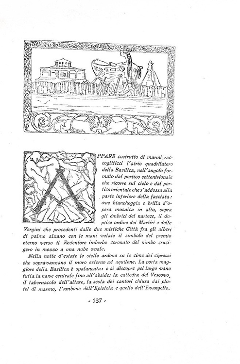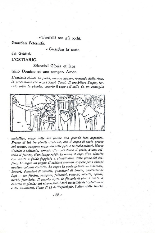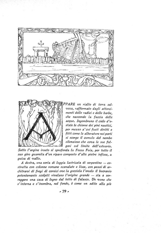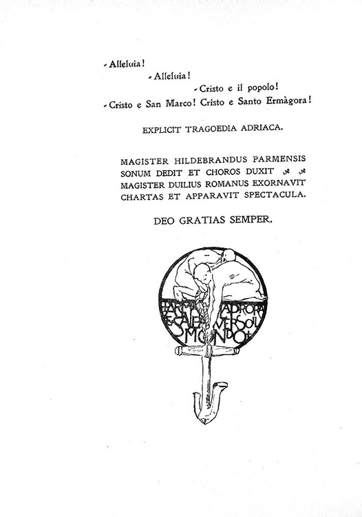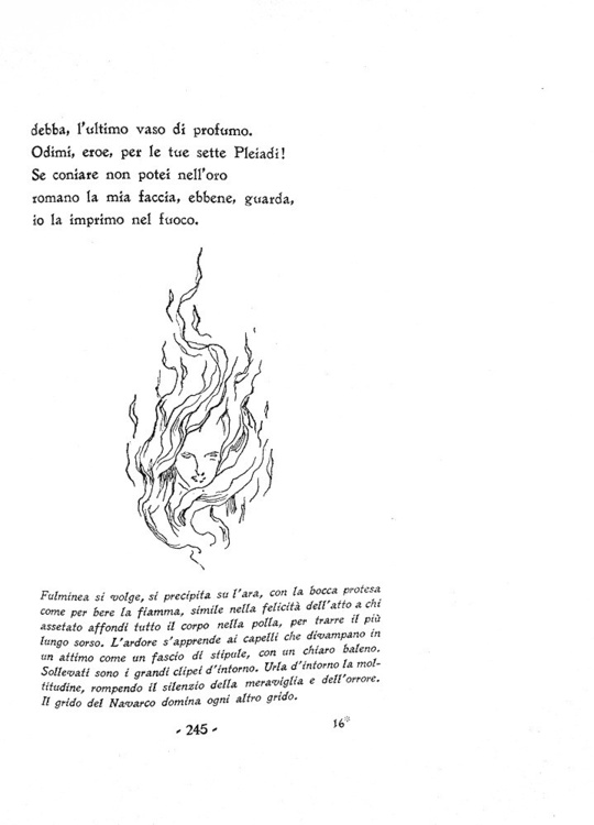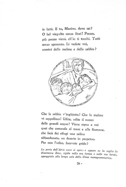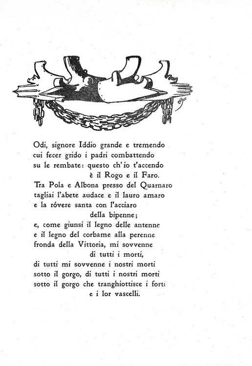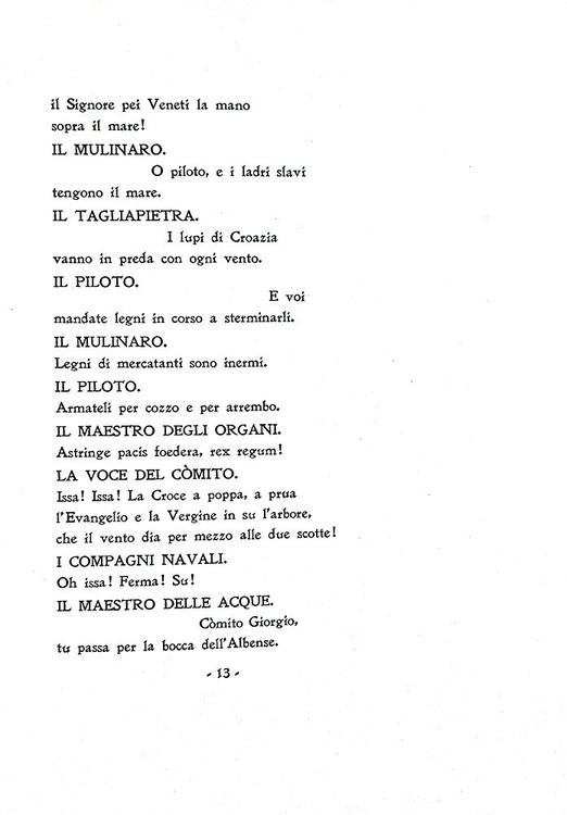 Cm. 23, pp. (8) 249 (3). Vignetta in rosso e in nero al frontespizio; testatine, capilettera e finalini incisi in xilografia su disegni di Cambellotti. Bellissima legatura strettamente coeva da amatore in mezzo marocchino pelle con titoli, ricchi fregi e data dell'opera in oro al dorso. Carta marmorizzata ai piatti e segnacolo in seta. Trascurabili segni del tempo e ordinaria patina del tempo alle estremità delle pagine, peraltro esemplare nel complesso fresco e ben conservato. Ricercata prima edizione (terzo migliaio, l'edizione originale, come accertato da De Medici, giunge sino al 15° migliaio). La tragedia, composta da un sirventese denominato “All'Adriatico”, un prologo e tre episodi, fu rappresentata (proprio nei giorni della pubblicazione) con gran successo al Teatro Argentina di Roma dalla Compagnia Stabile. Cfr. Iccu; De Medici, nr. 68; Gambetti-Vezzosi, Rarità bibliografiche del Novecento italiano, p. 254.